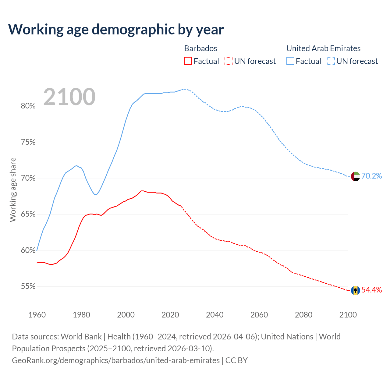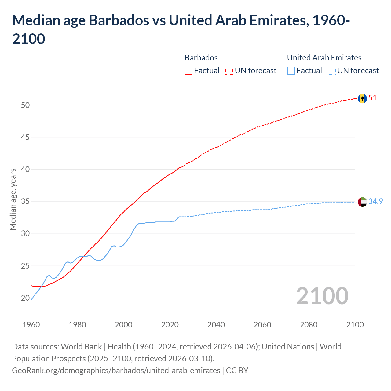 Median age Barbados vs United Arab Emirates, 1960-2100