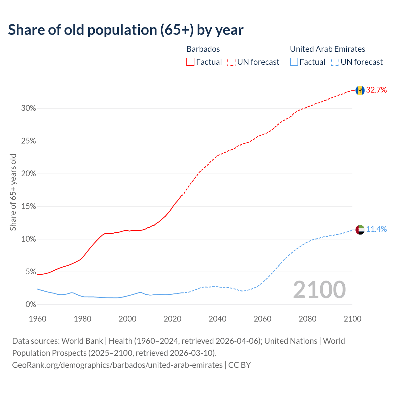 The share of older people aged 65 and over is 16.6% in Barbados and 1.77% in the United Arab Emirates. Life expectancy in Barbados compared to the United Arab Emirates .