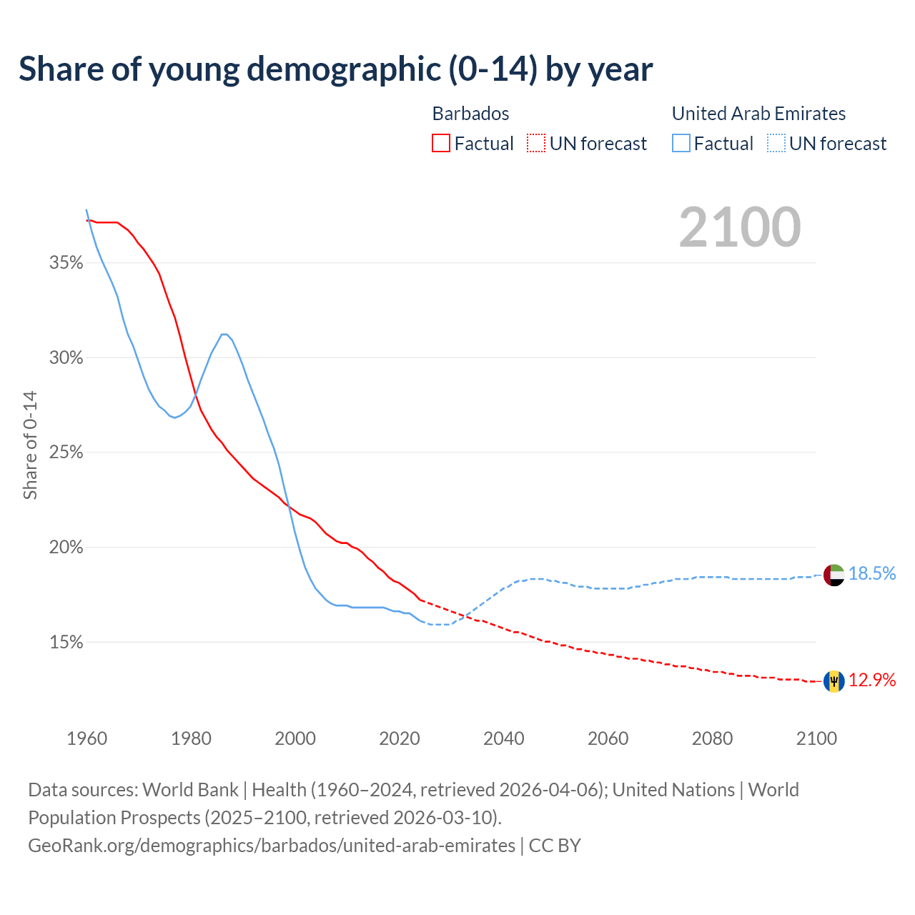 - The share of young demographic (0-15 years old) in Barbados is 17.2% vs 16.1% in the United Arab Emirates.