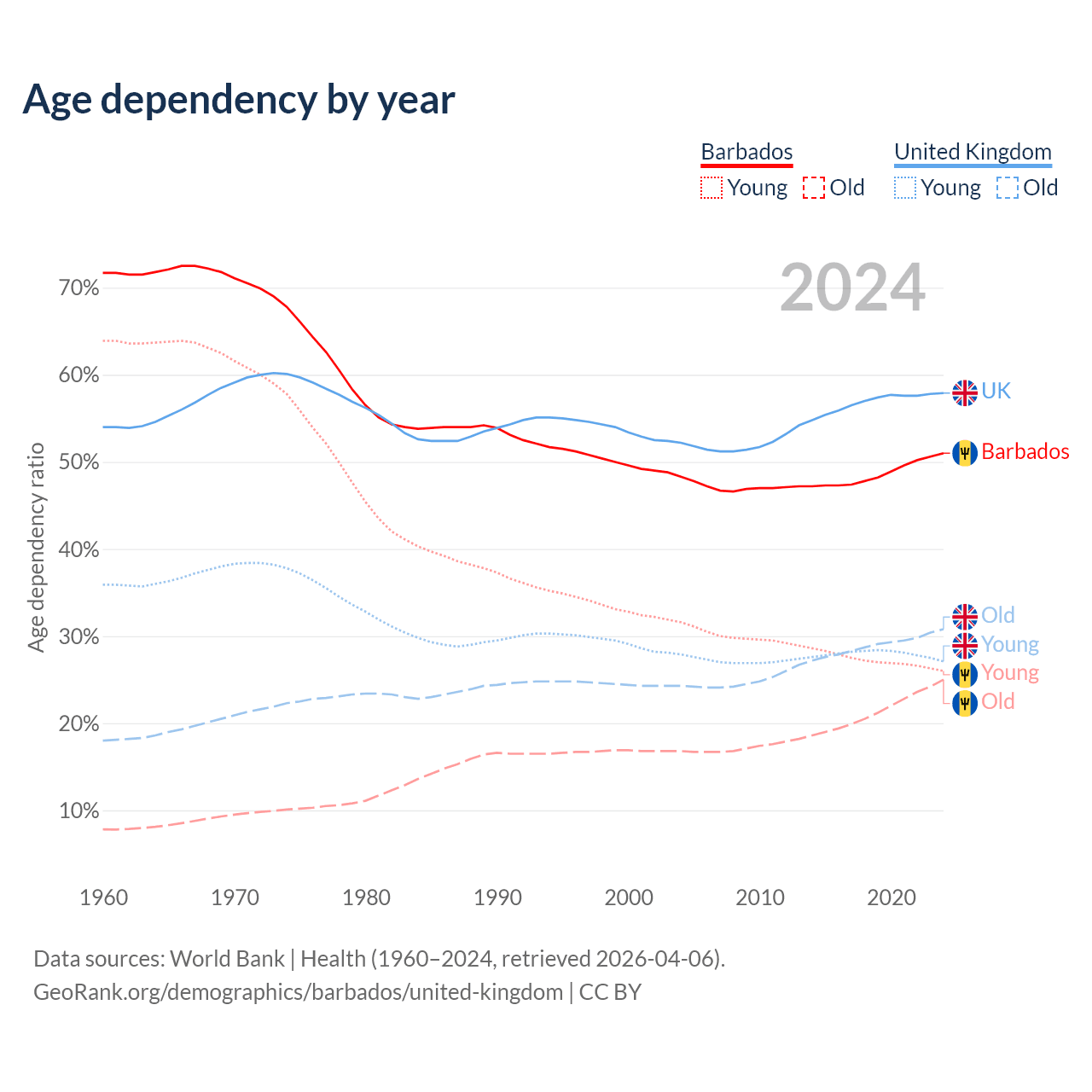 - Barbados is ranked 47/196 by median age (oldest to youngest) vs 41/196 for the United Kingdom.