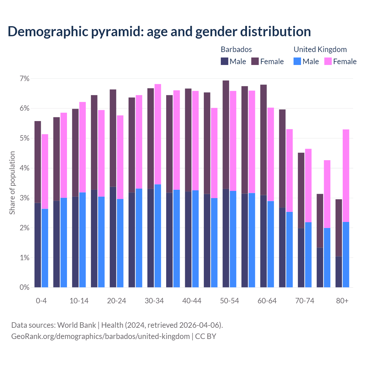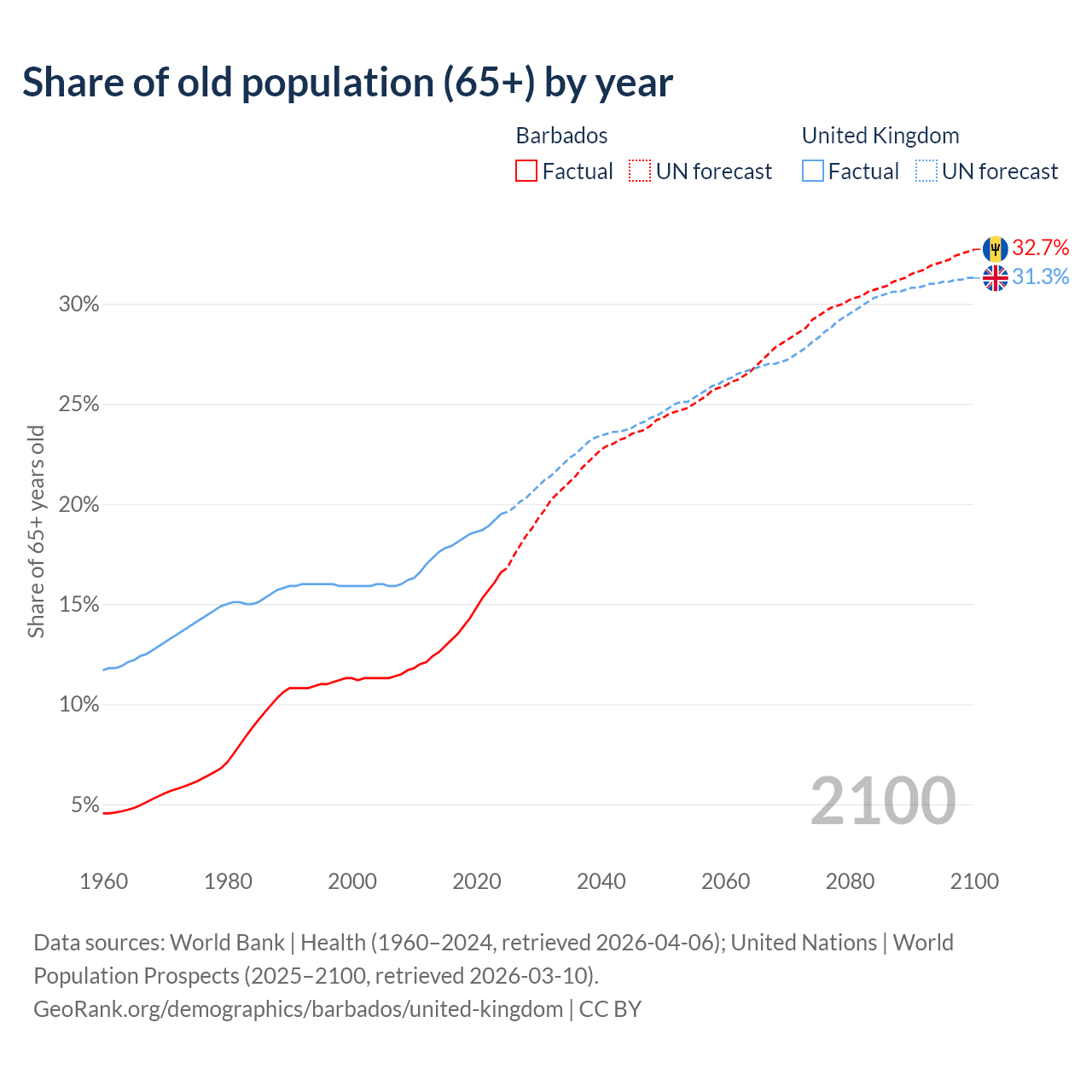 The share of older people aged 65 and over is 16.6% in Barbados and 19.5% in the United Kingdom. Life expectancy in Barbados compared to the United Kingdom .