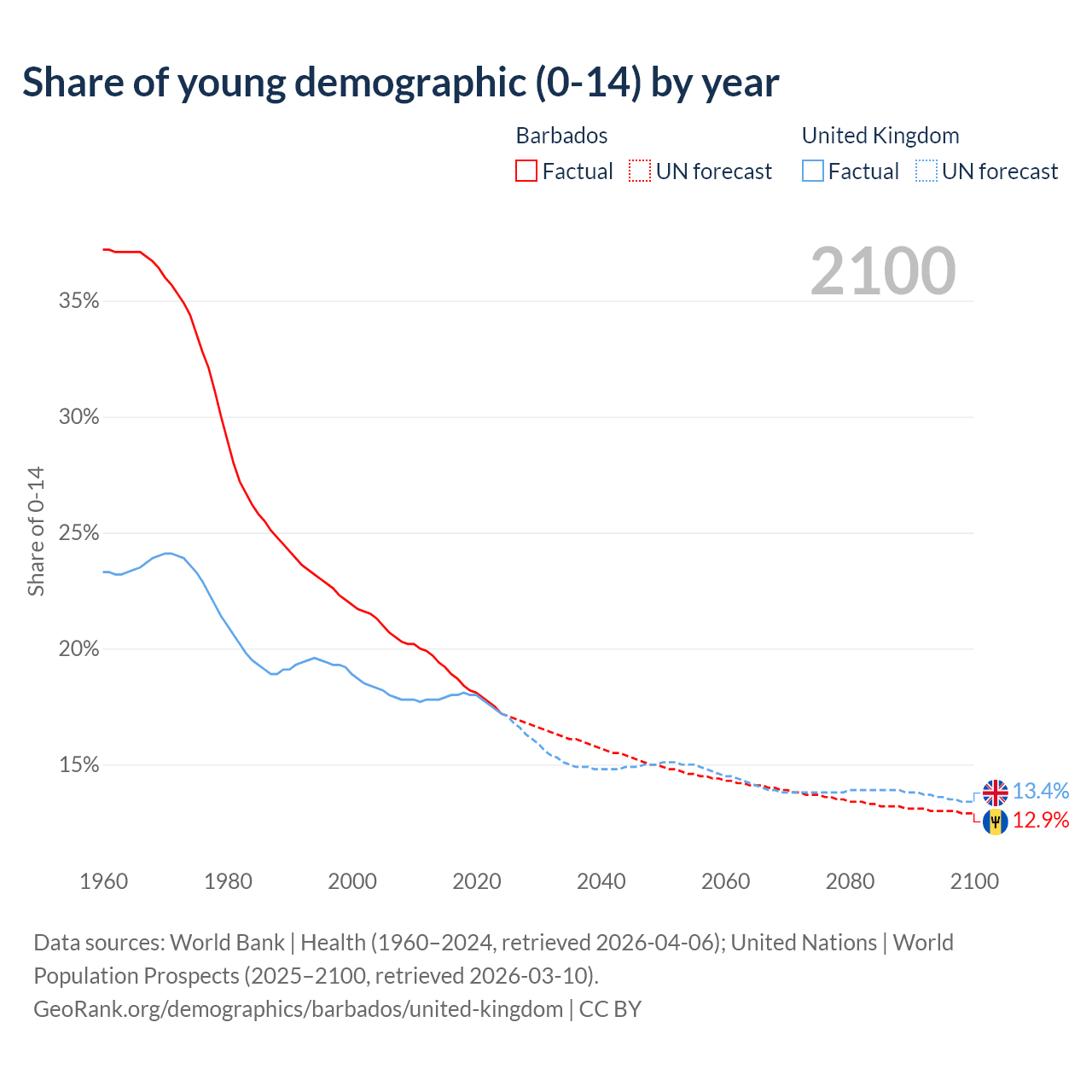 - The share of young demographic (0-15 years old) in Barbados is 17.2% vs 17.2% in the United Kingdom.