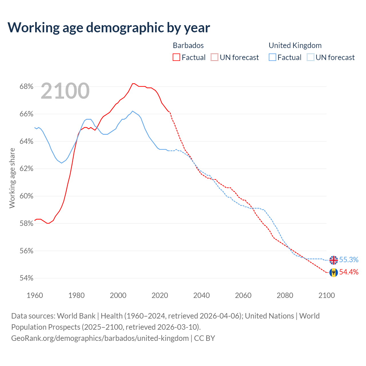 Median age Barbados vs United Kingdom, 1960-2100