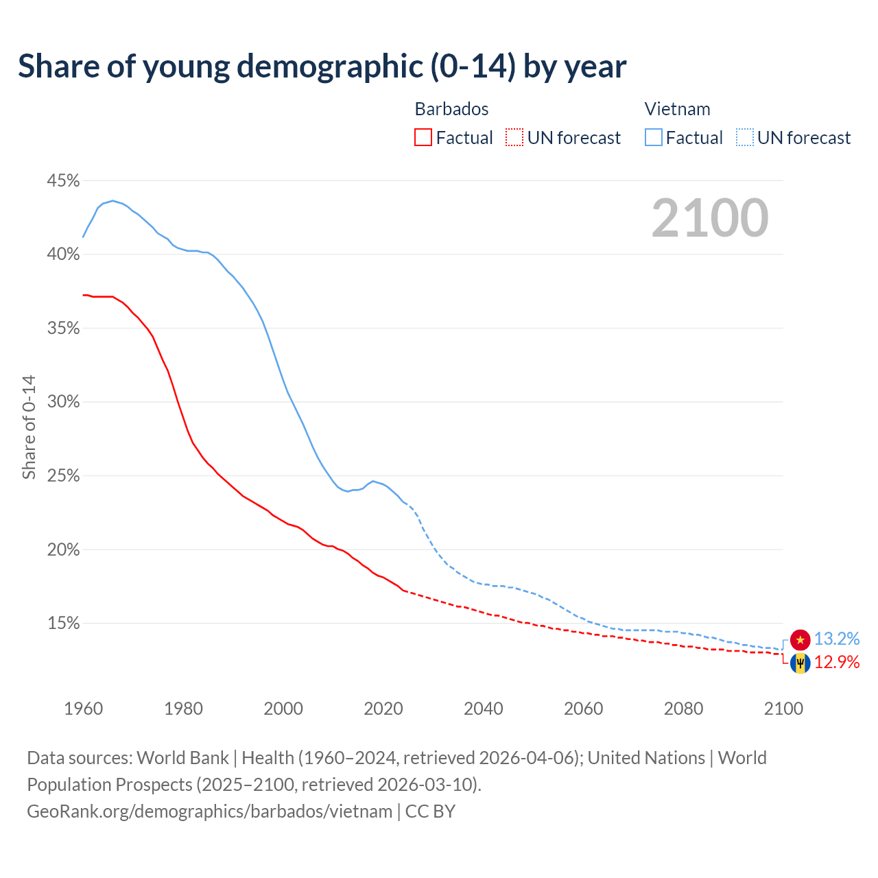 - The share of young demographic (0-15 years old) in Barbados is 17.2% vs 23.2% in Vietnam.