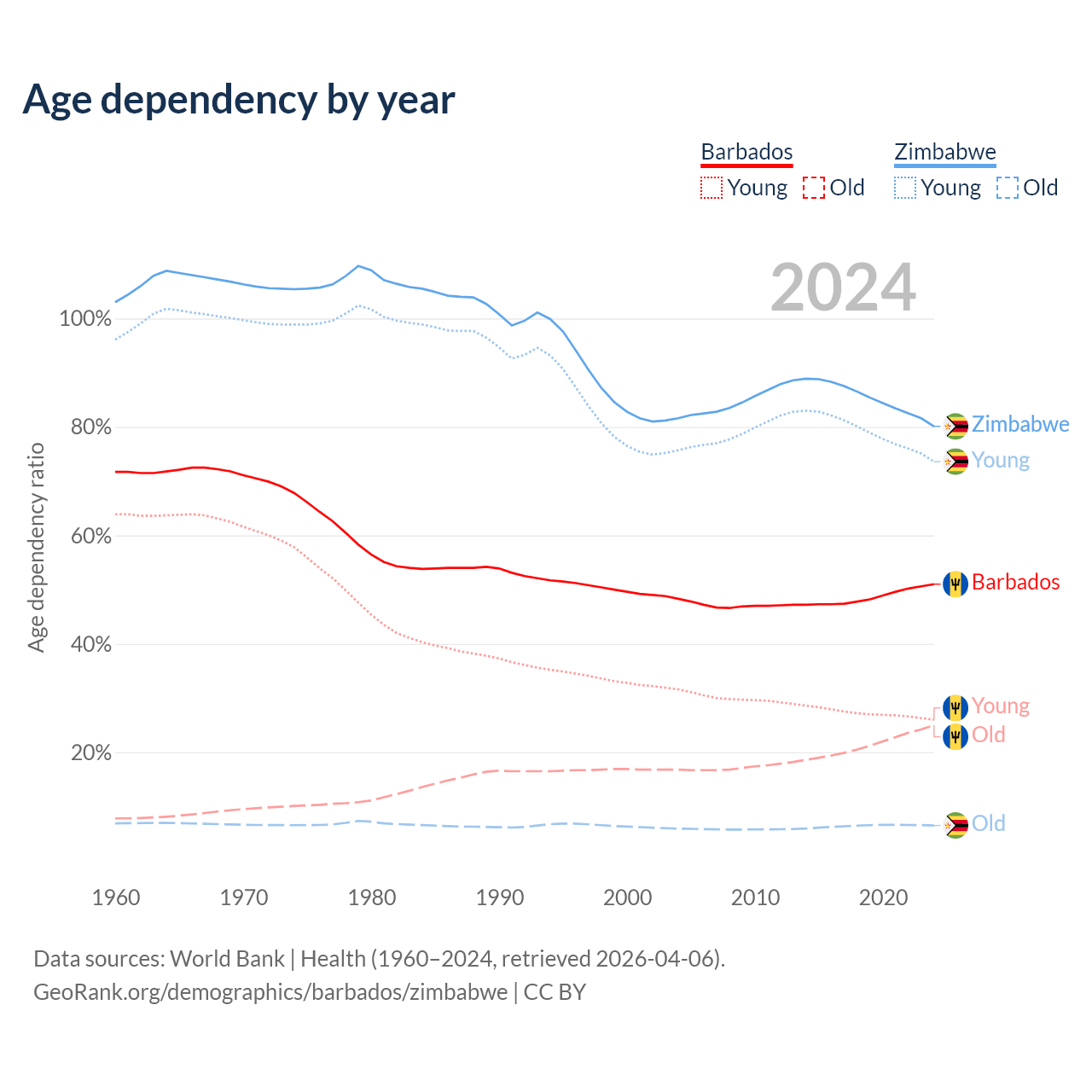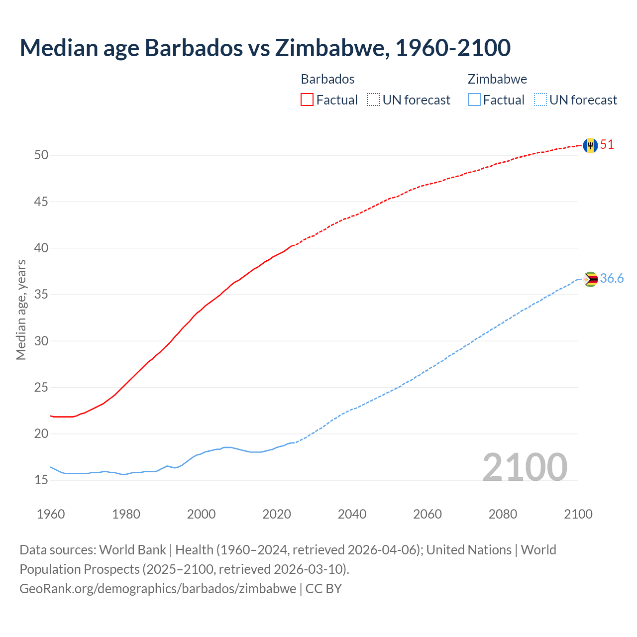 - Barbados is ranked 47/196 by median age (oldest to youngest) vs 177/196 for Zimbabwe.