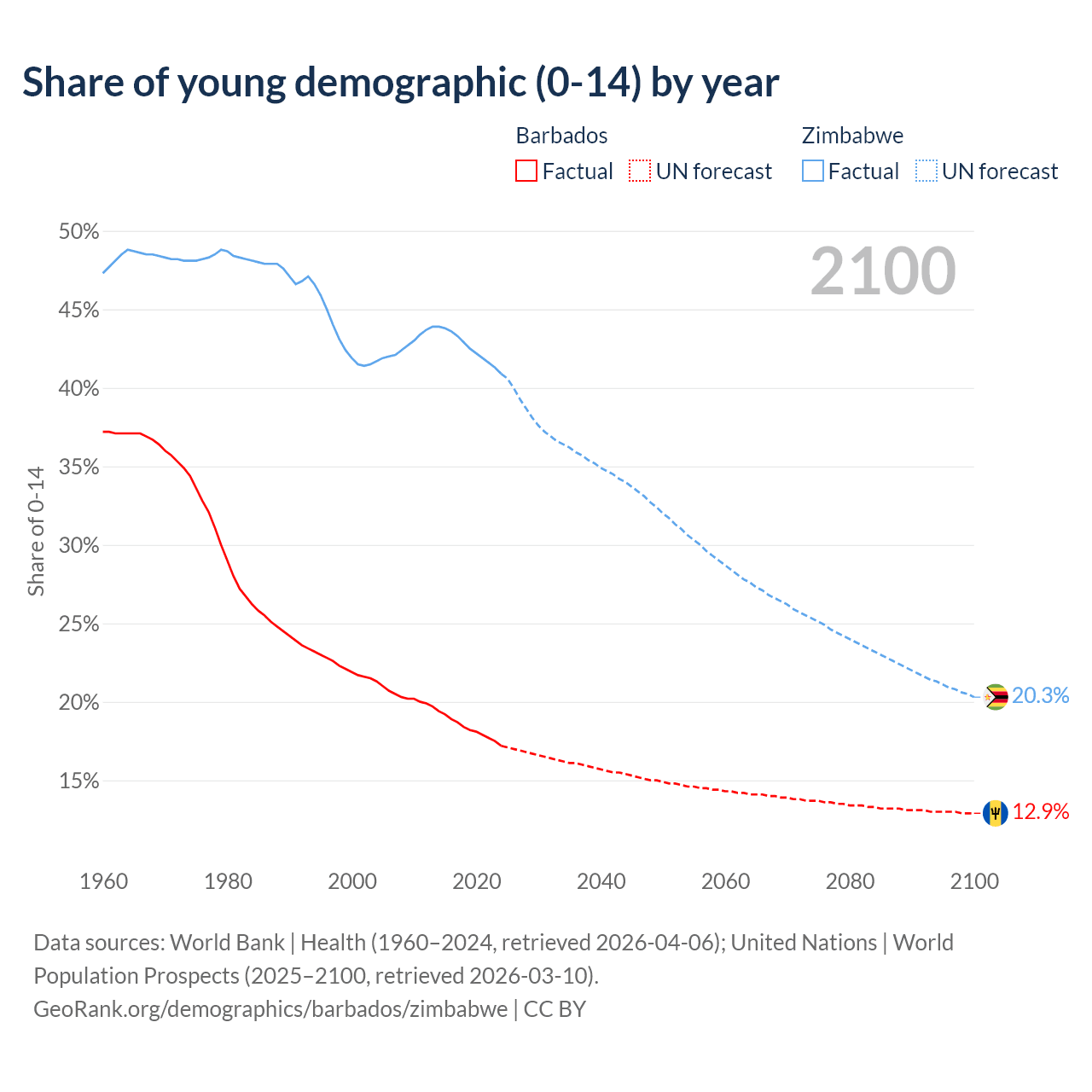 - The share of young demographic (0-15 years old) in Barbados is 17.2% vs 40.9% in Zimbabwe.