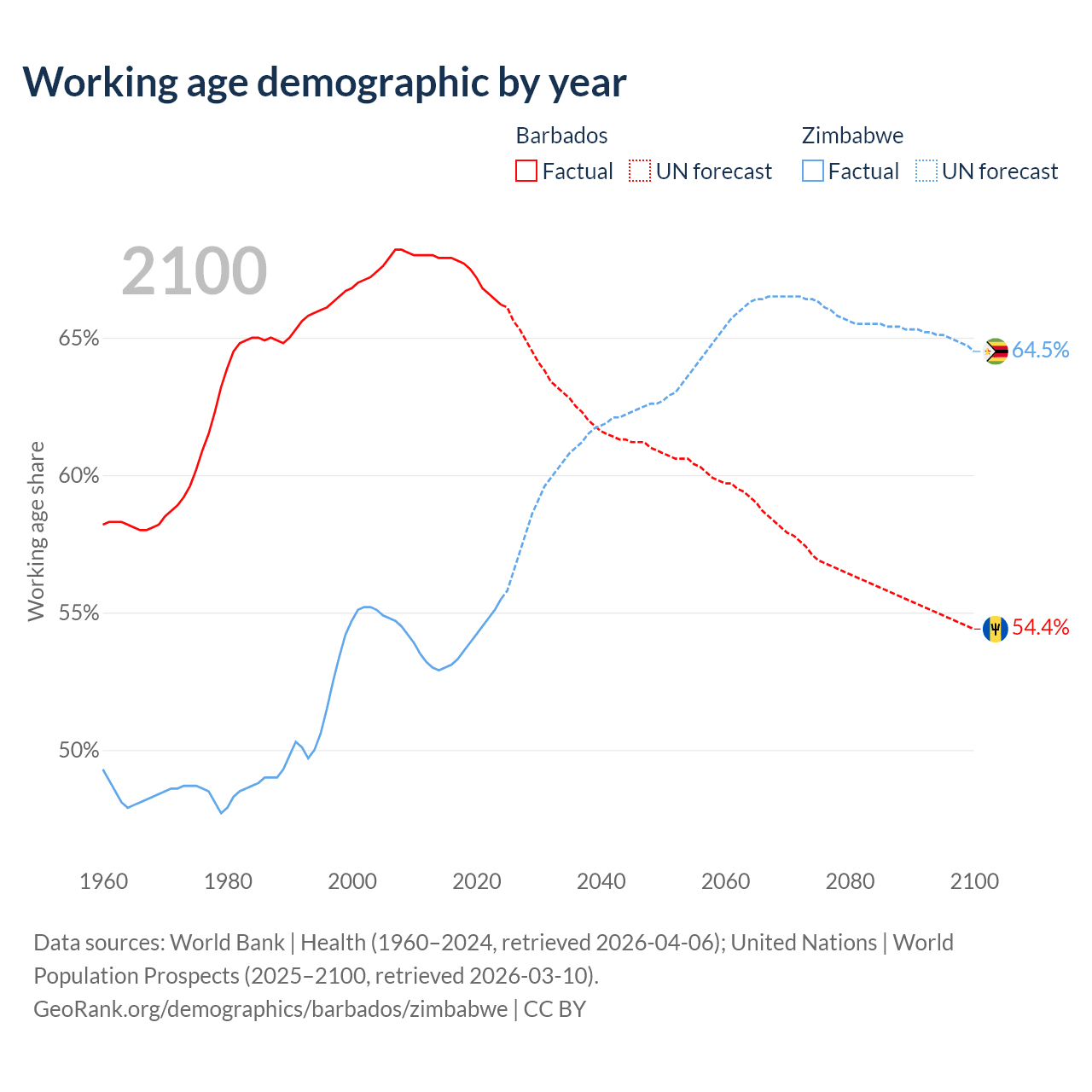 - Barbados has 187K working age adults (aged 15-64) vs 9.64M in Zimbabwe.