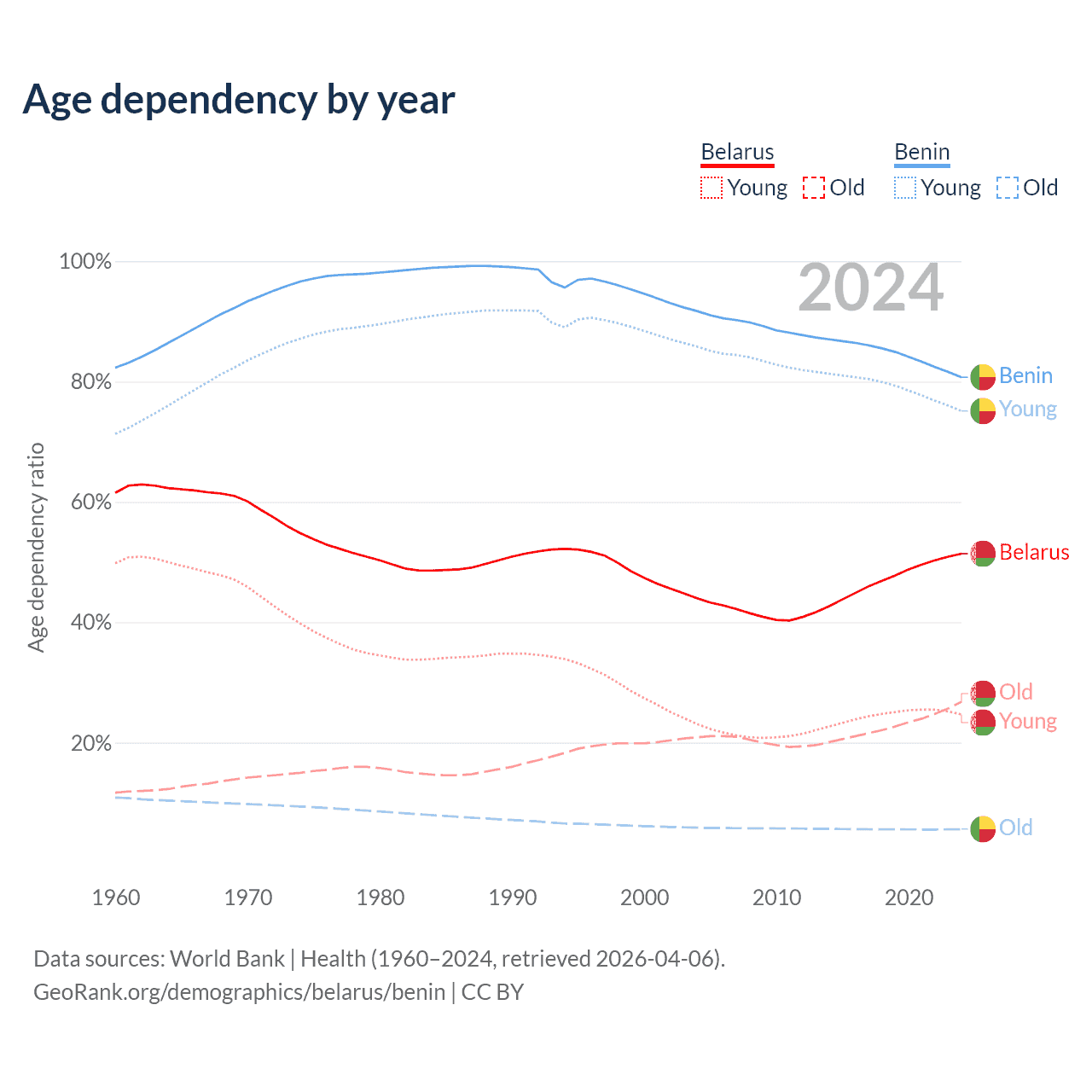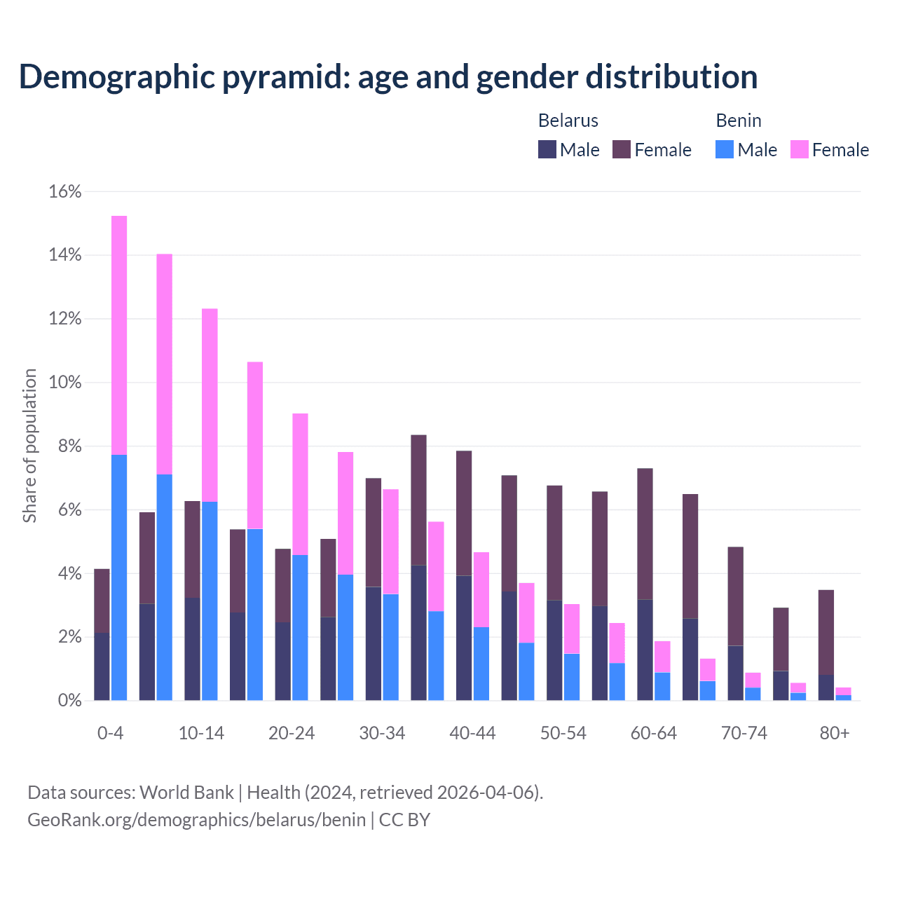- Belarus is ranked 35/196 by median age (oldest to youngest) vs 179/196 for Benin.
