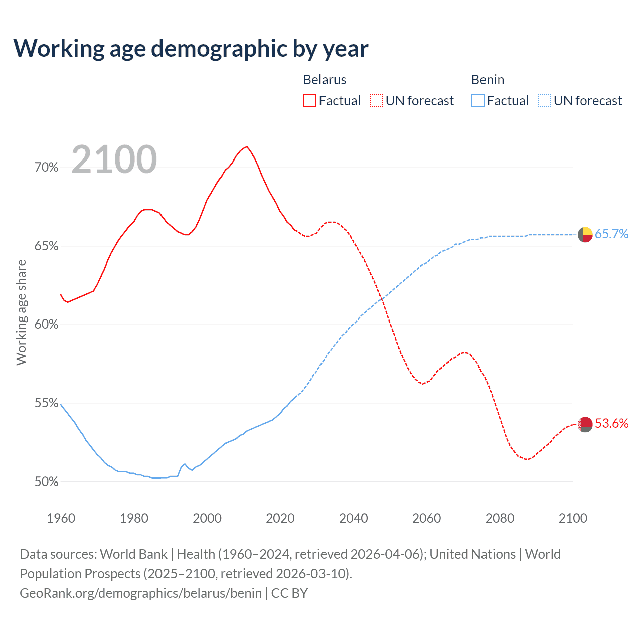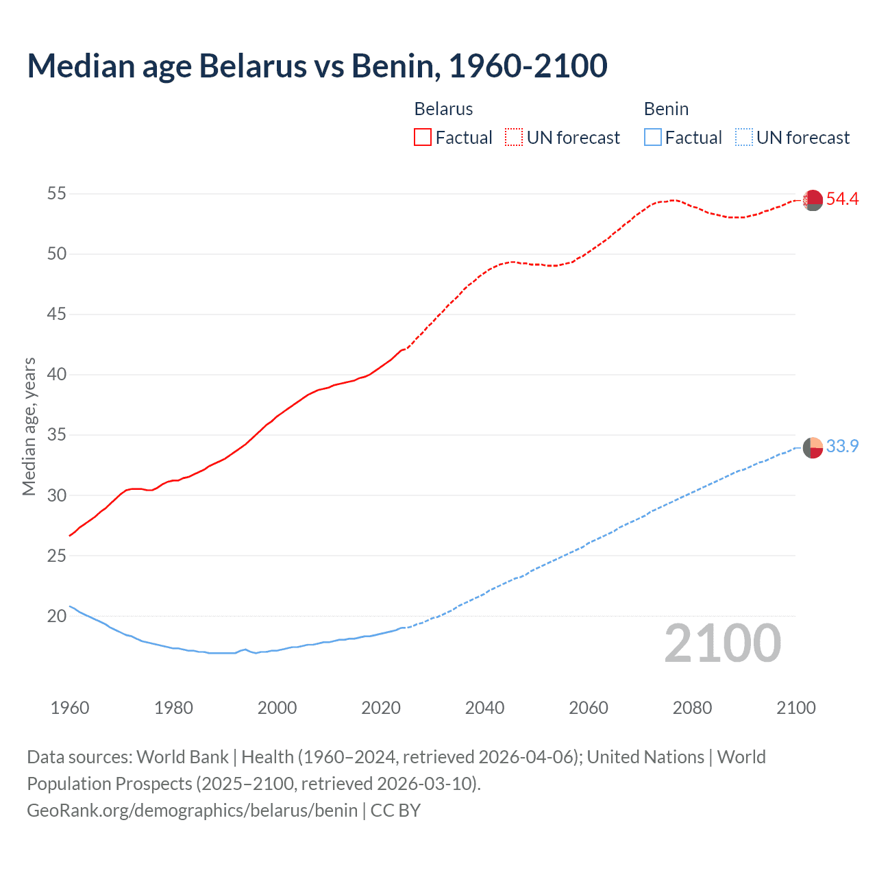 Median age Belarus vs Benin, 1960-2100