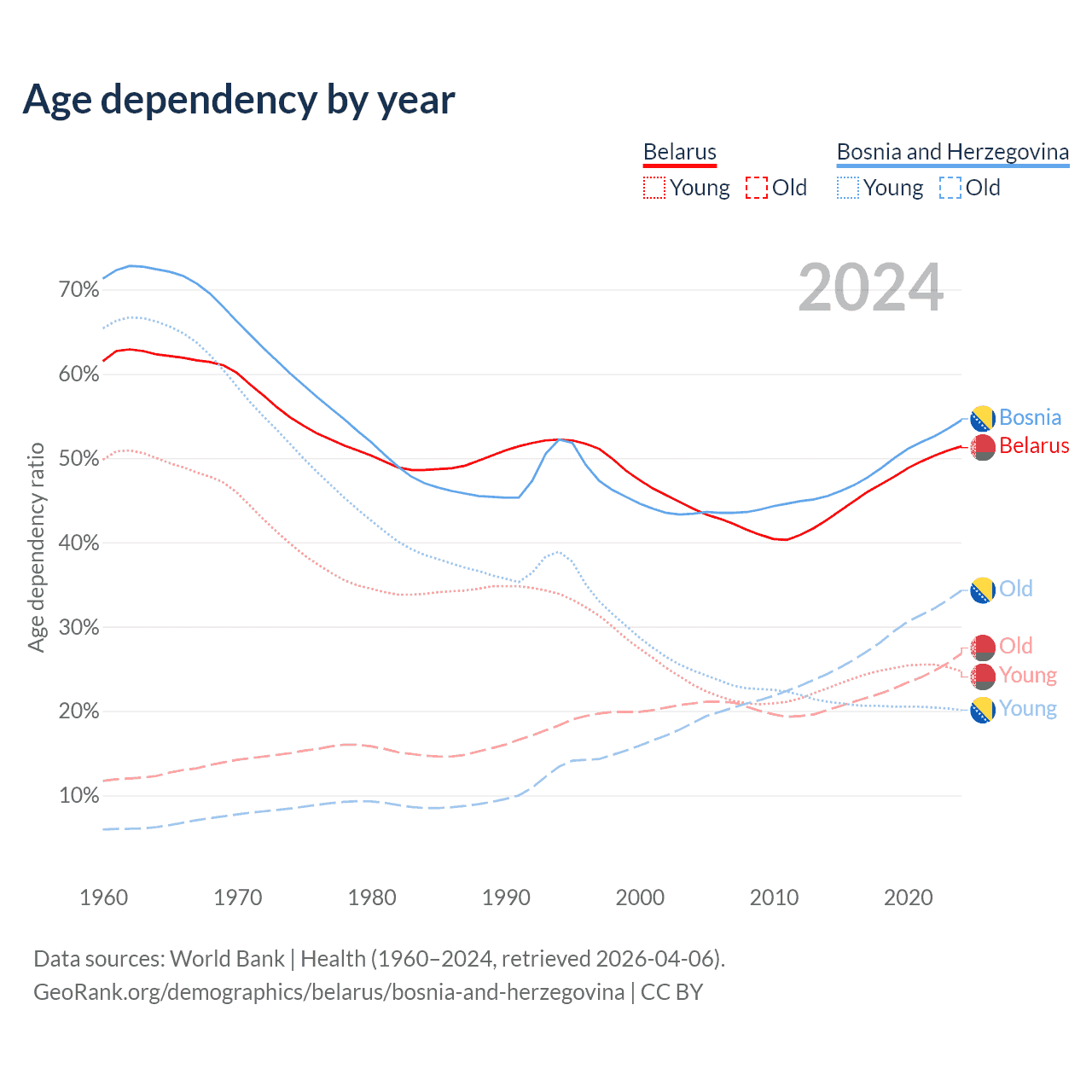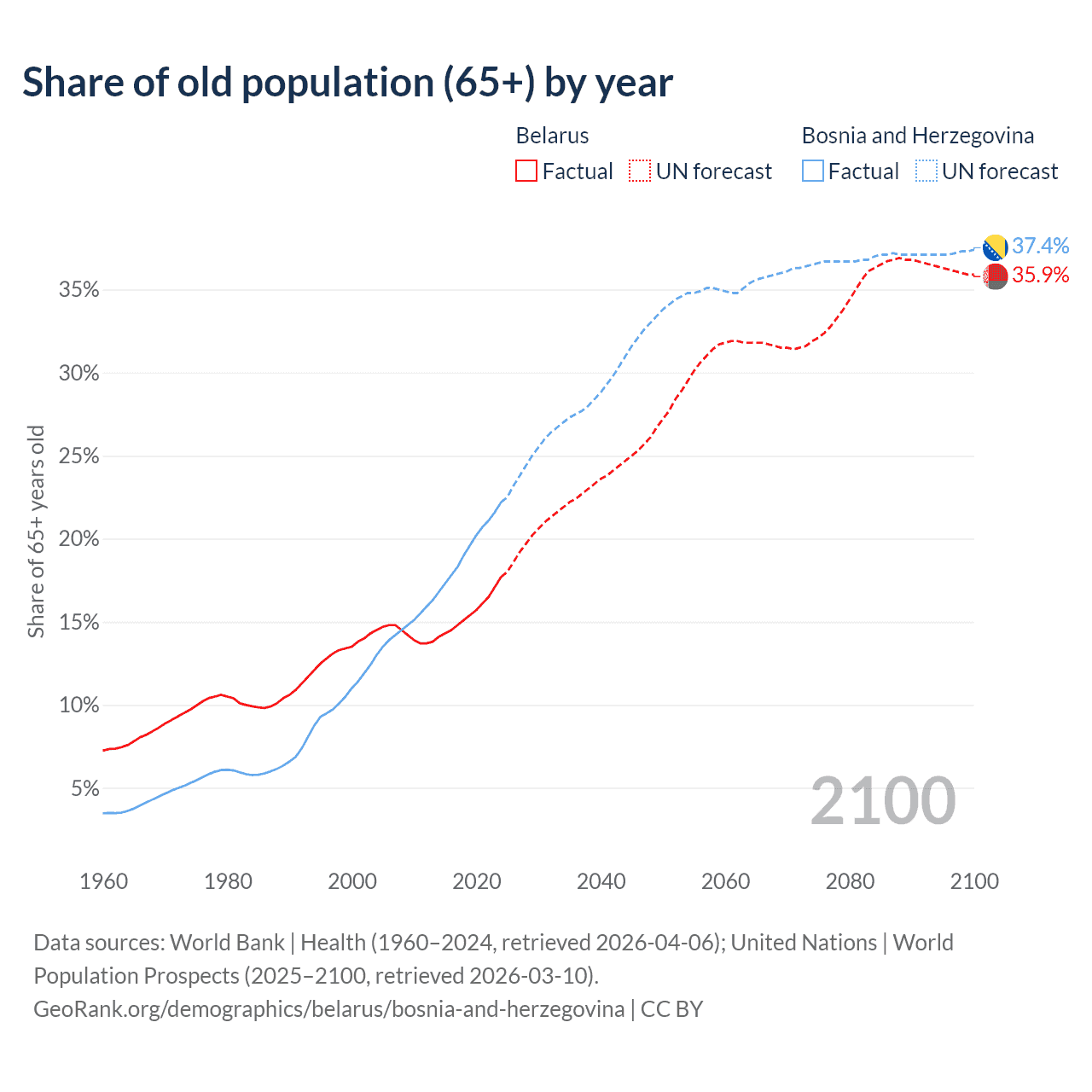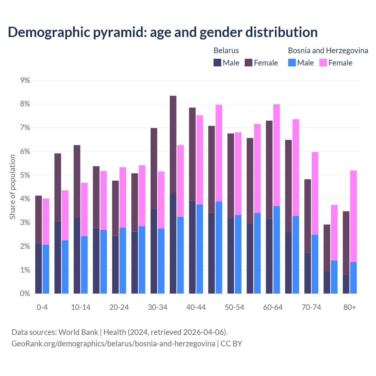 The share of older people aged 65 and over is 17.7% in Belarus and 22.2% in Bosnia and Herzegovina. Life expectancy in Belarus compared to Bosnia and Herzegovina .