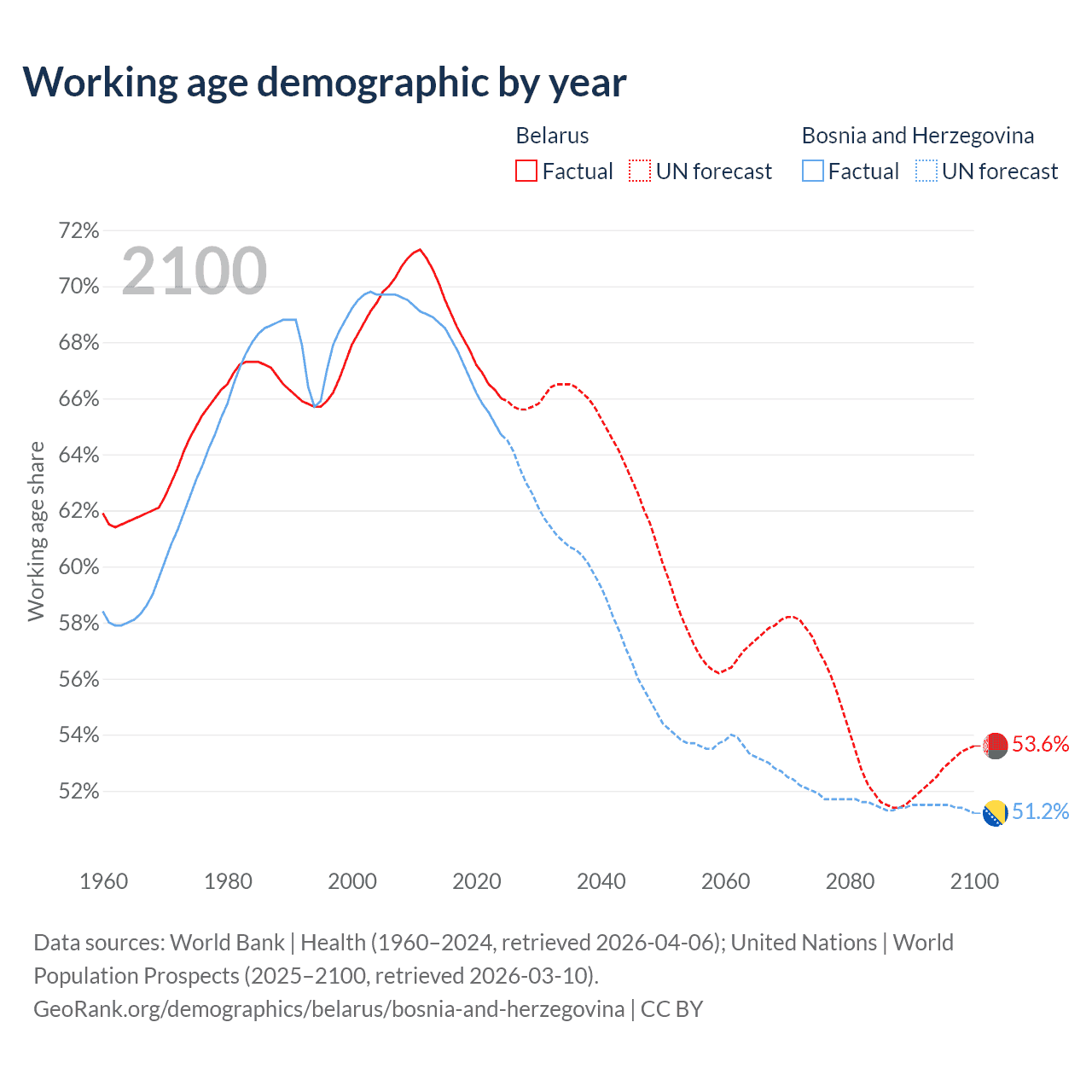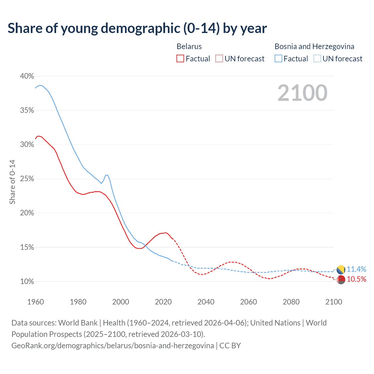 Median age Belarus vs Bosnia and Herzegovina, 1960-2100