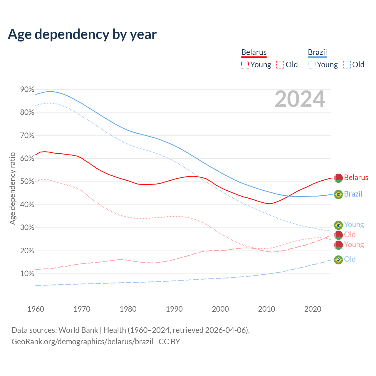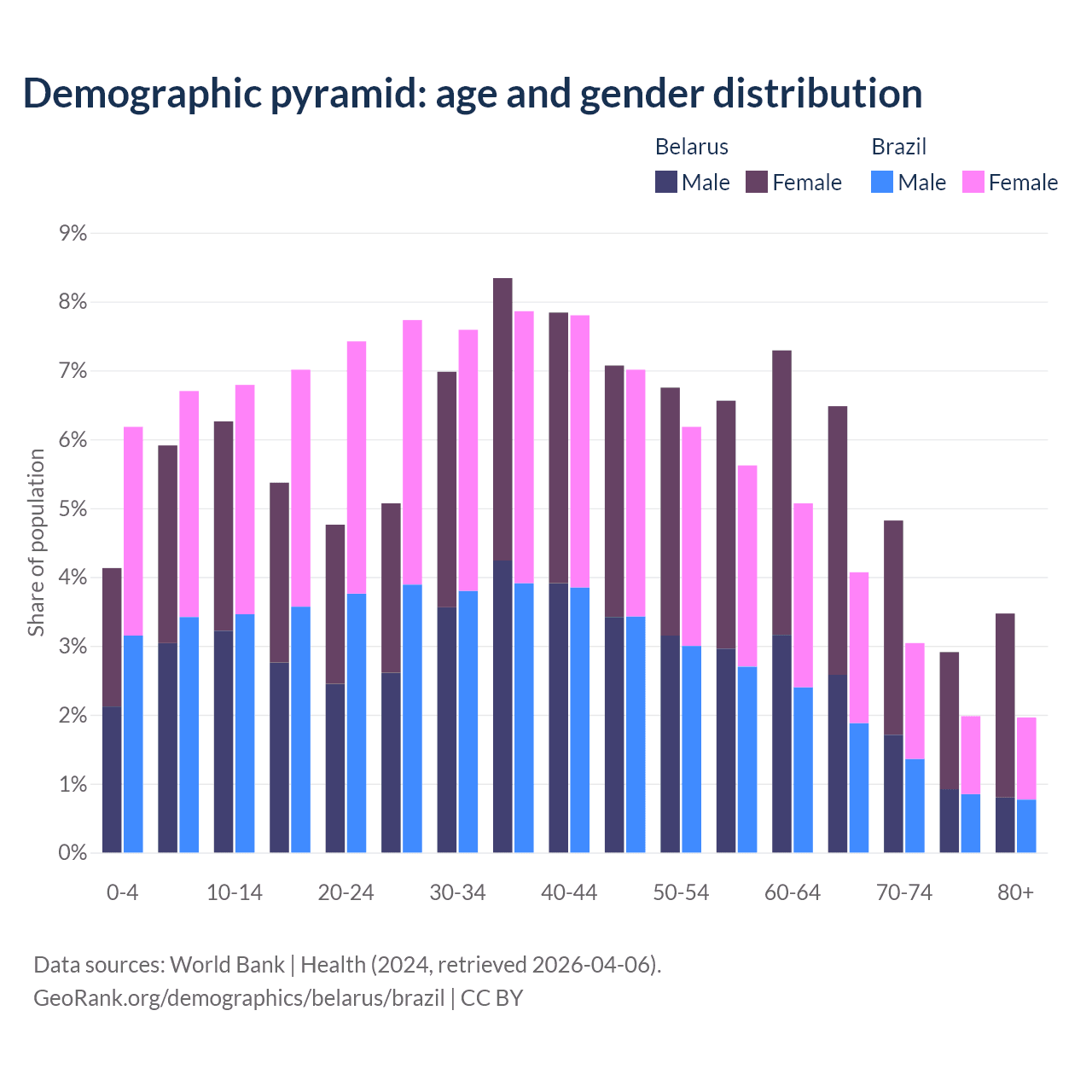 - Belarus is ranked 35/196 by median age (oldest to youngest) vs 73/196 for Brazil.