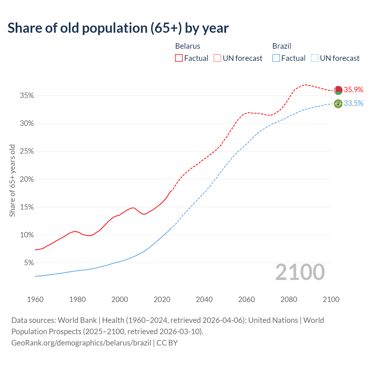 The share of older people aged 65 and over is 17.7% in Belarus and 11% in Brazil. Life expectancy in Belarus compared to Brazil .