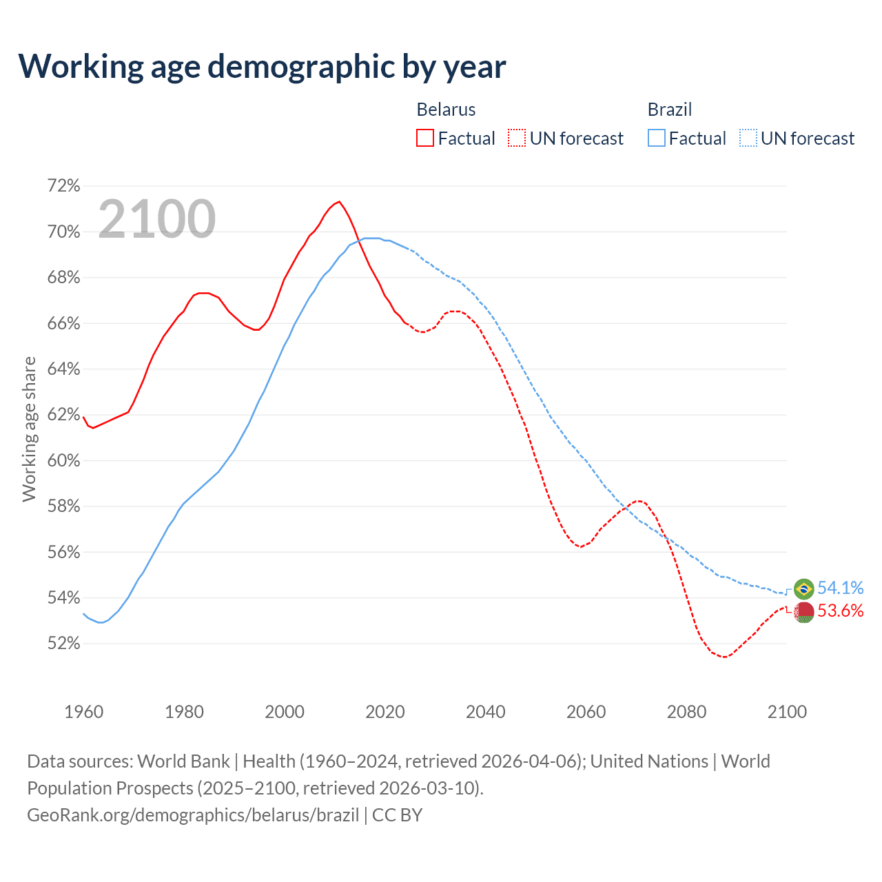 Median age Belarus vs Brazil, 1960-2100