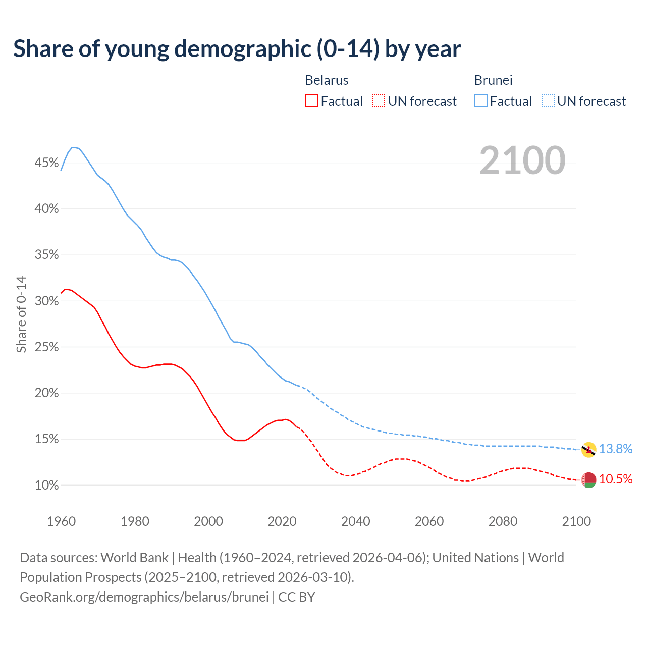 - The share of young demographic (0-15 years old) in Belarus is 16.3% vs 20.8% in Brunei.