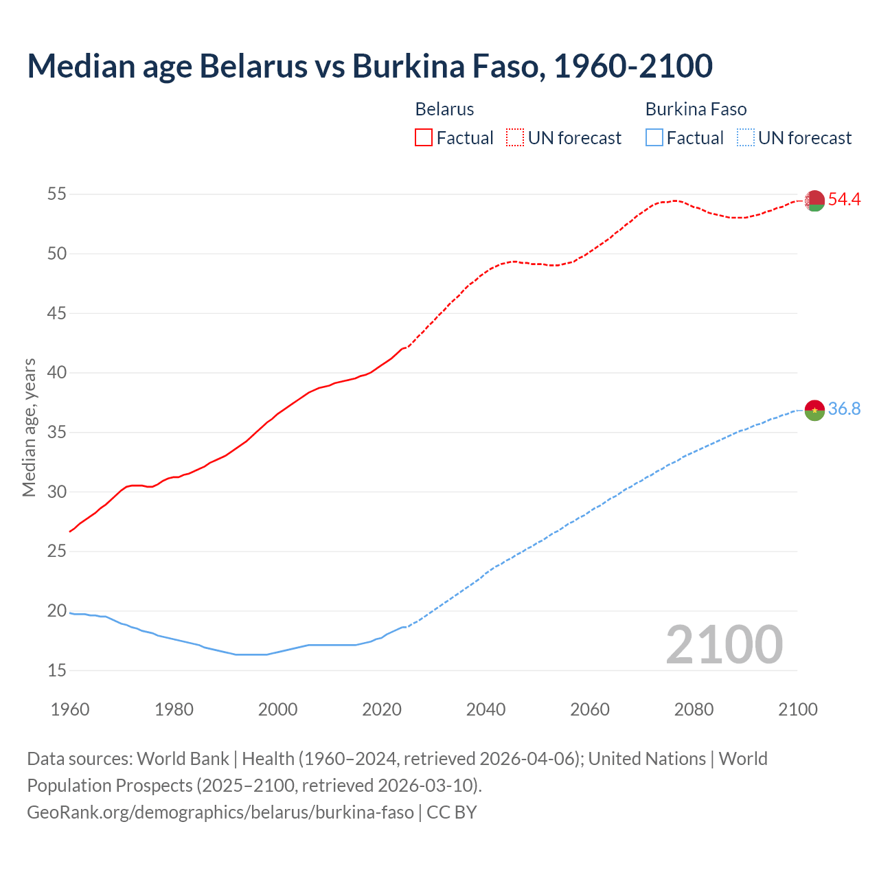 Median age Belarus vs Burkina Faso, 1960-2100