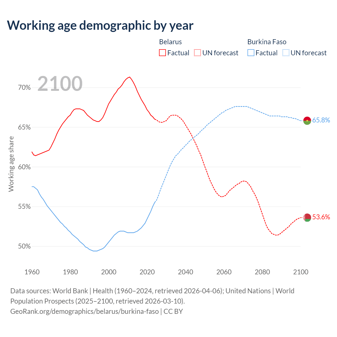 - Belarus has 5.95M working age adults (aged 15-64) vs 13.8M in Burkina Faso.