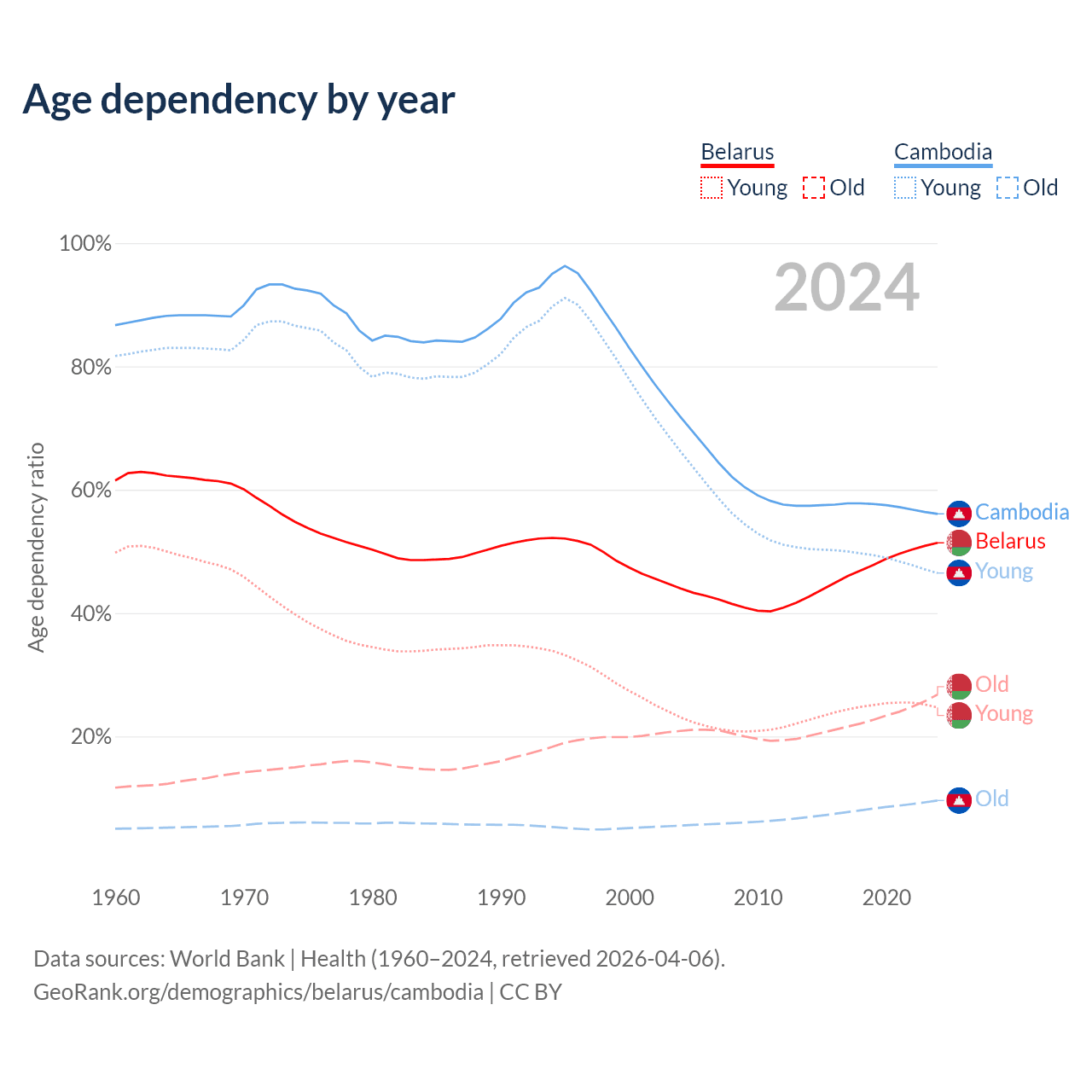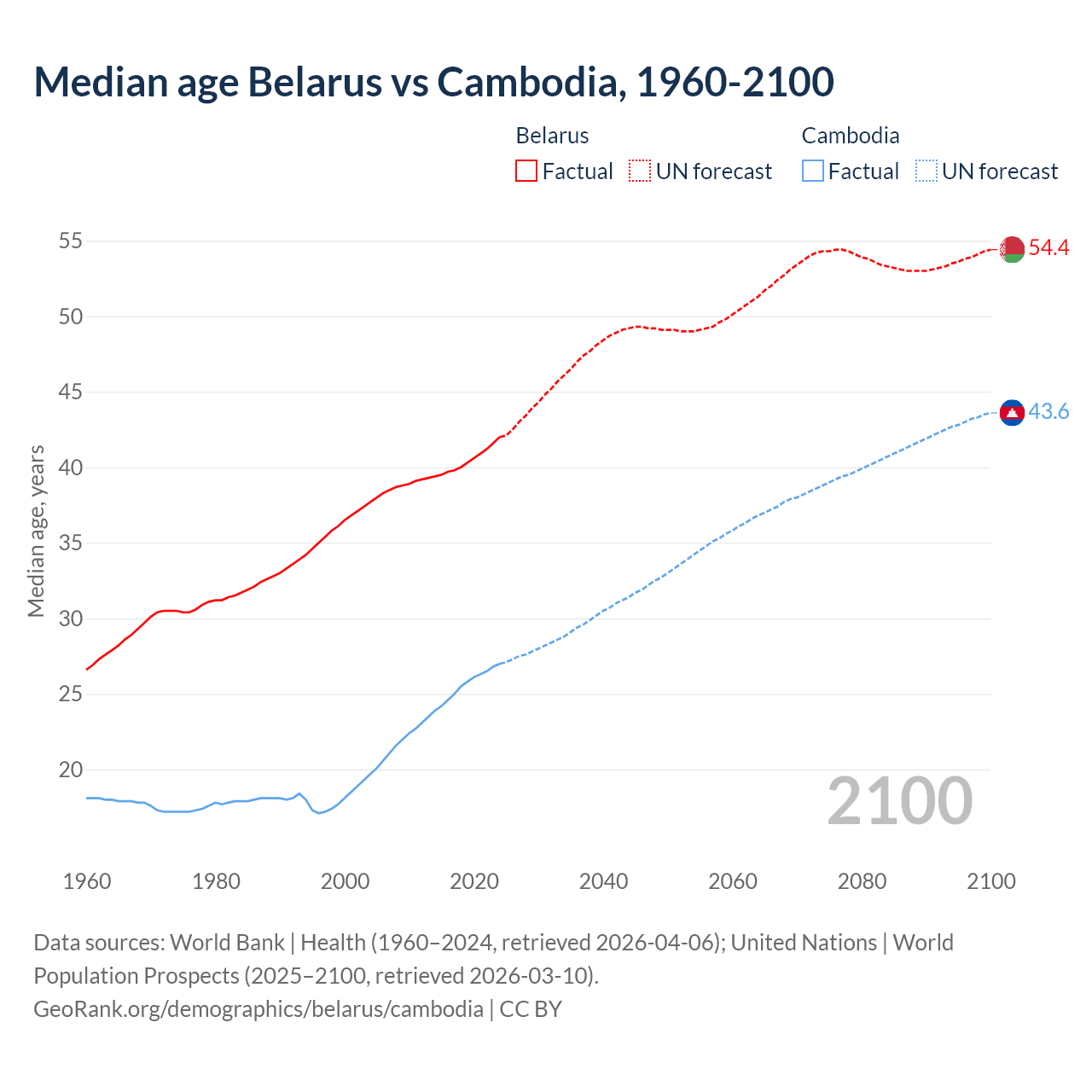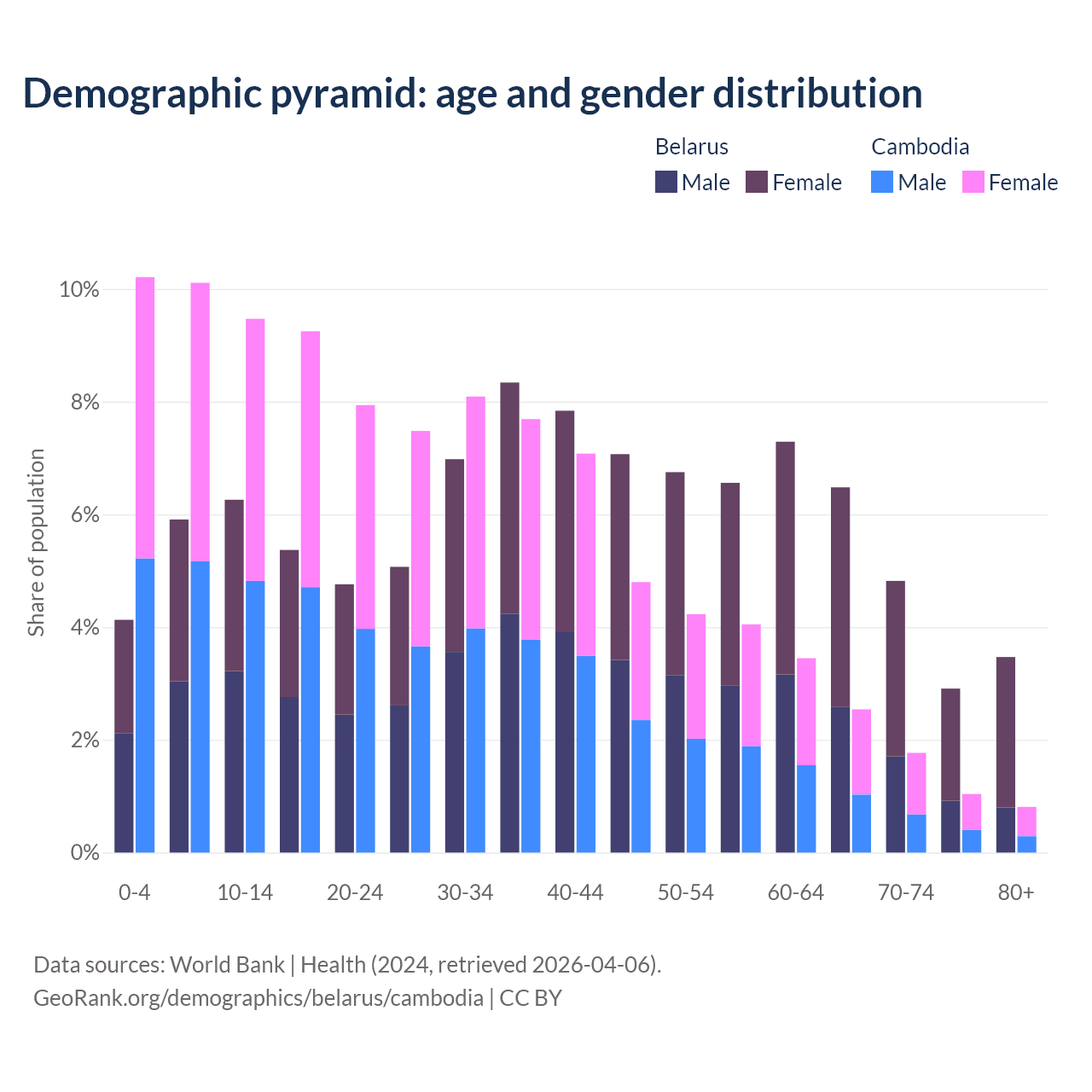 - Belarus is ranked 35/196 by median age (oldest to youngest) vs 121/196 for Cambodia.