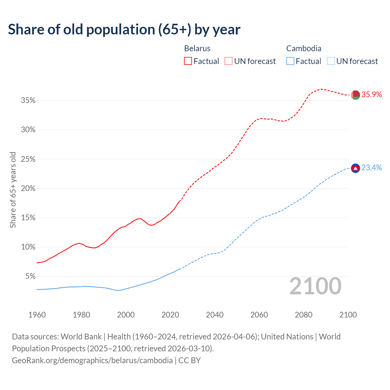 The share of older people aged 65 and over is 17.7% in Belarus and 6.16% in Cambodia. Life expectancy in Belarus compared to Cambodia .
