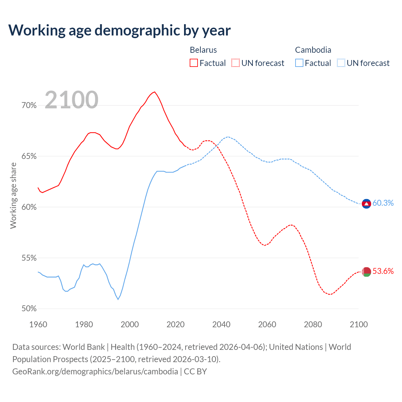 - Belarus has 5.95M working age adults (aged 15-64) vs 11.6M in Cambodia.