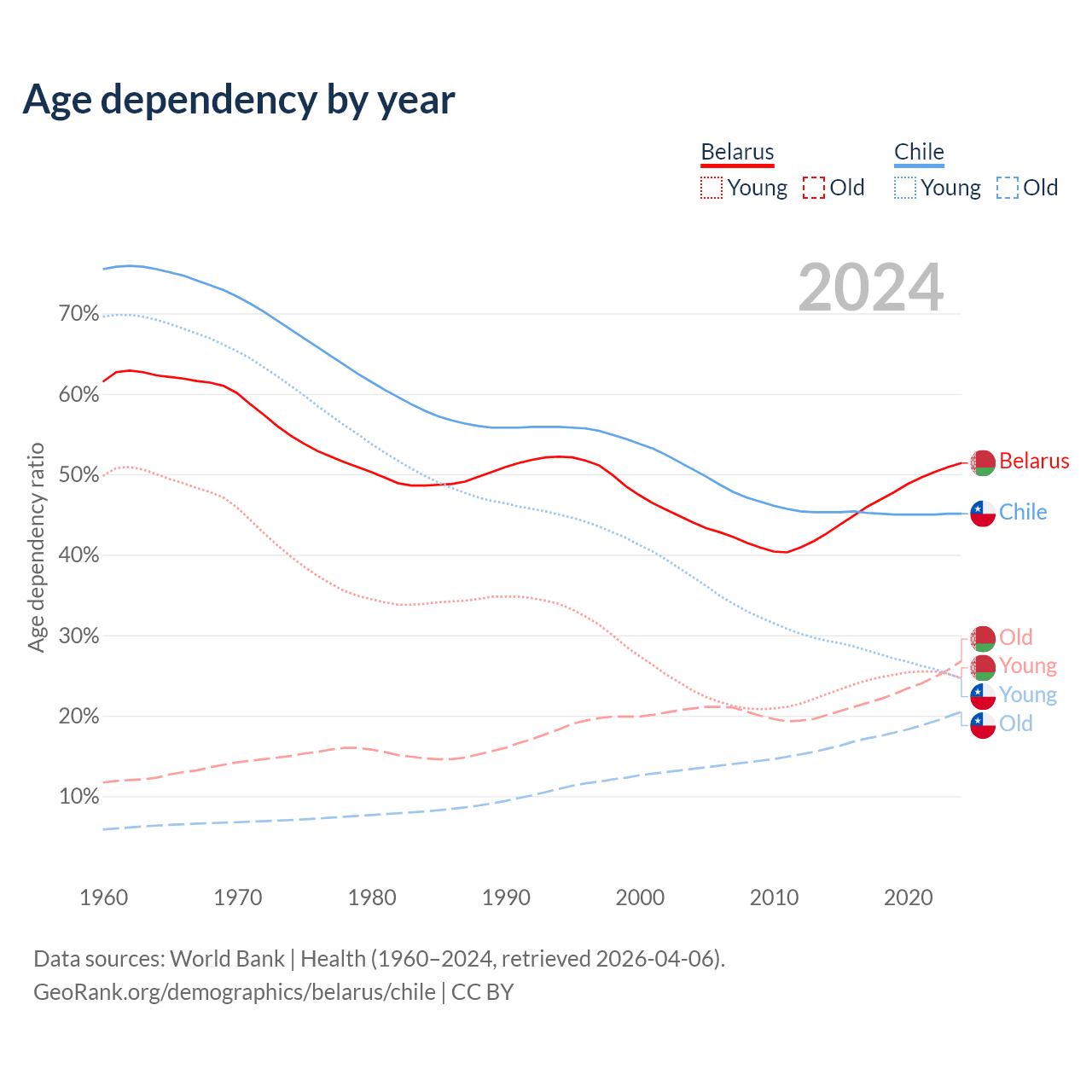- Belarus is ranked 35/196 by median age (oldest to youngest) vs 61/196 for Chile.