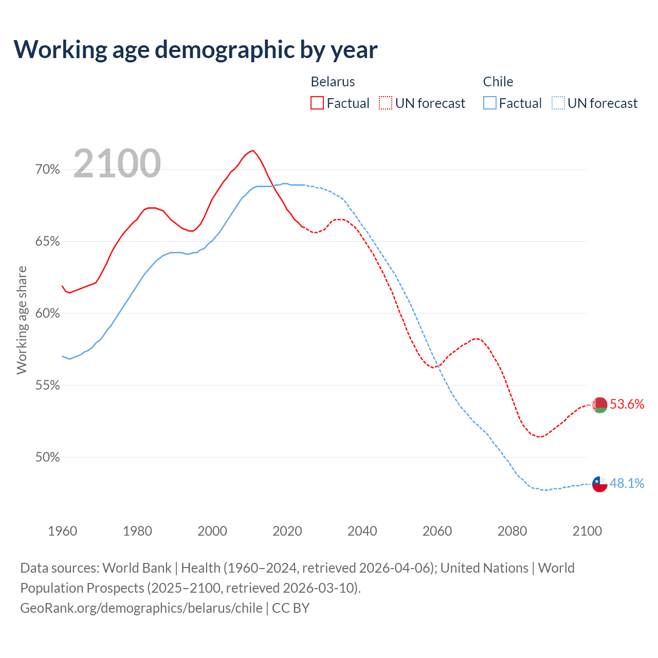 Median age Belarus vs Chile, 1960-2100