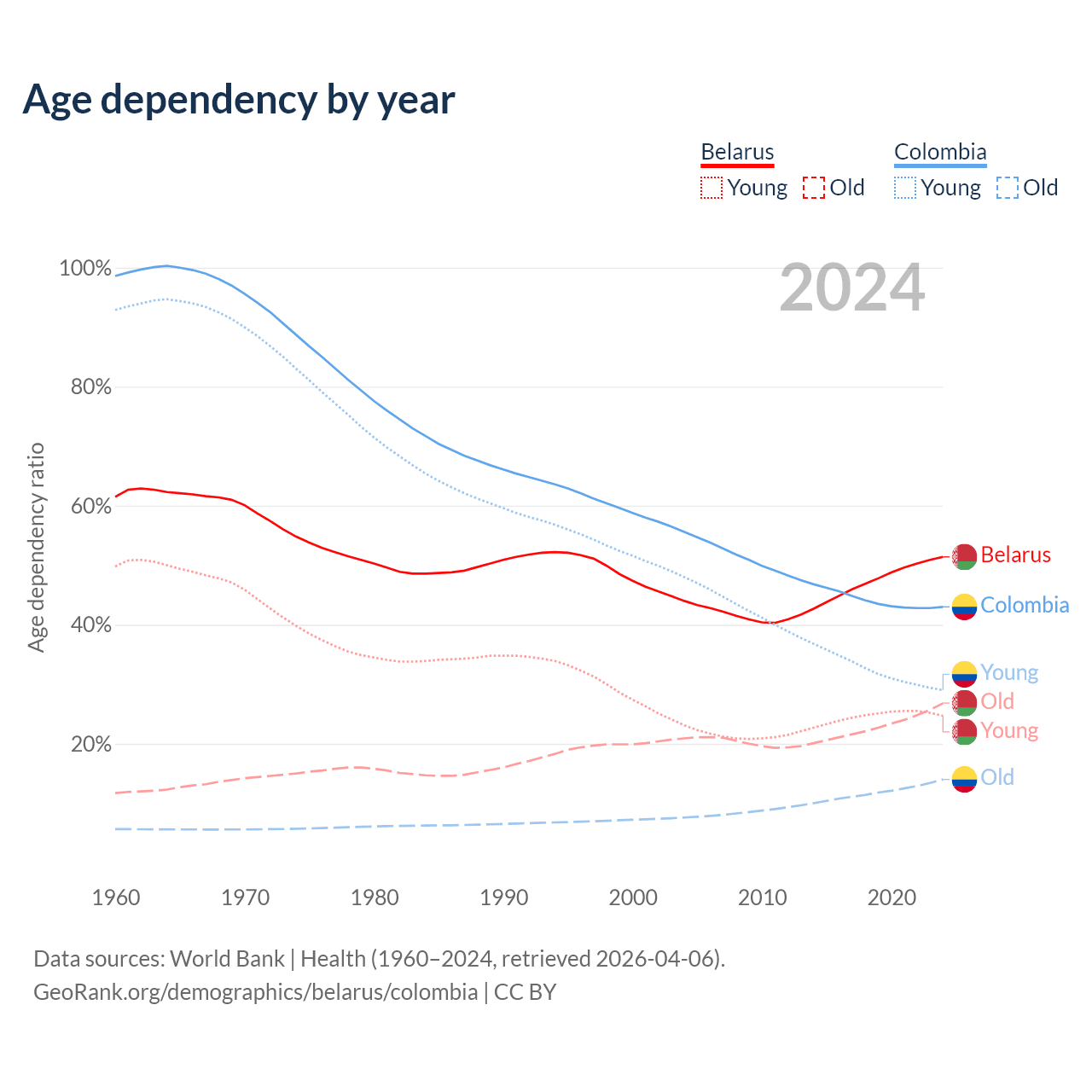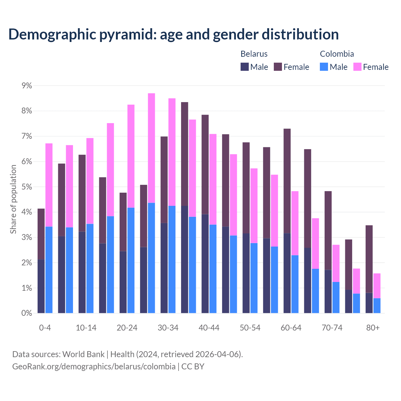- Belarus is ranked 35/196 by median age (oldest to youngest) vs 89/196 for Colombia.
