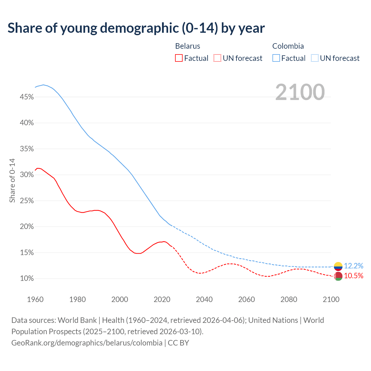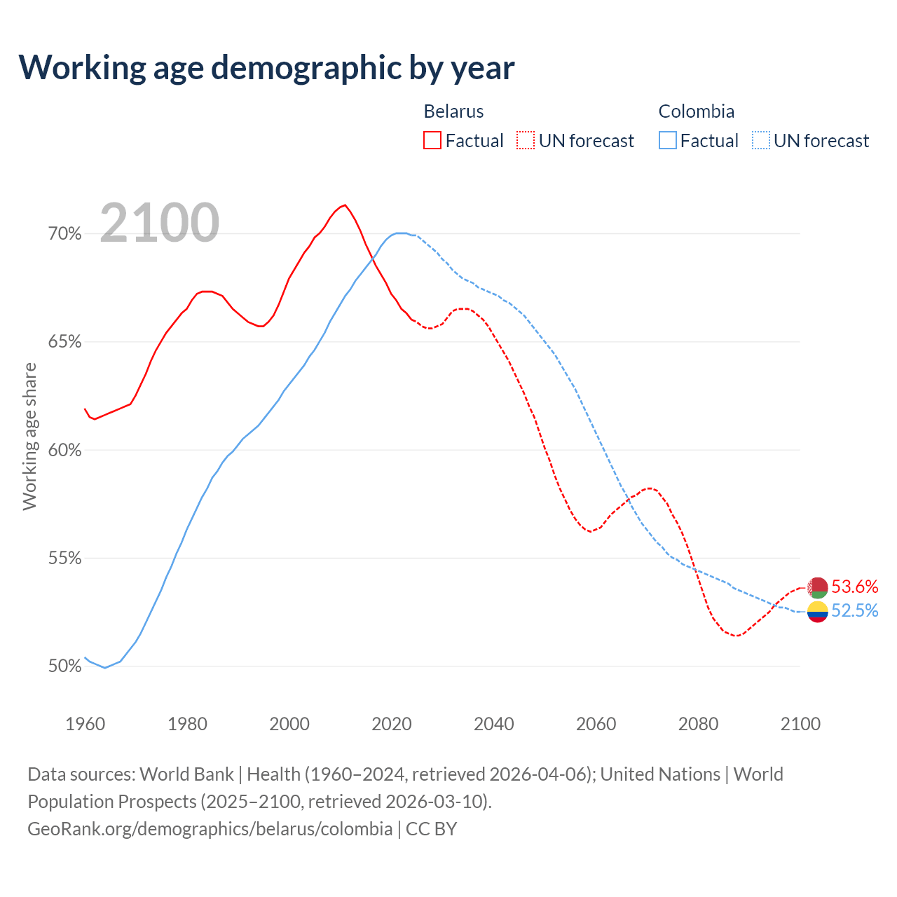 Median age Belarus vs Colombia, 1960-2100