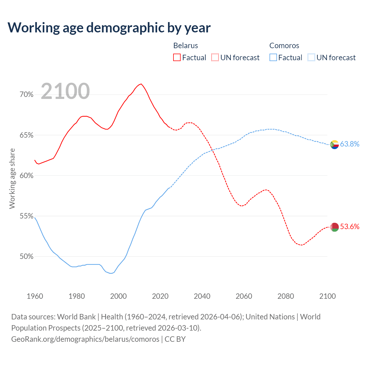 - Belarus has 5.95M working age adults (aged 15-64) vs 528K in Comoros.