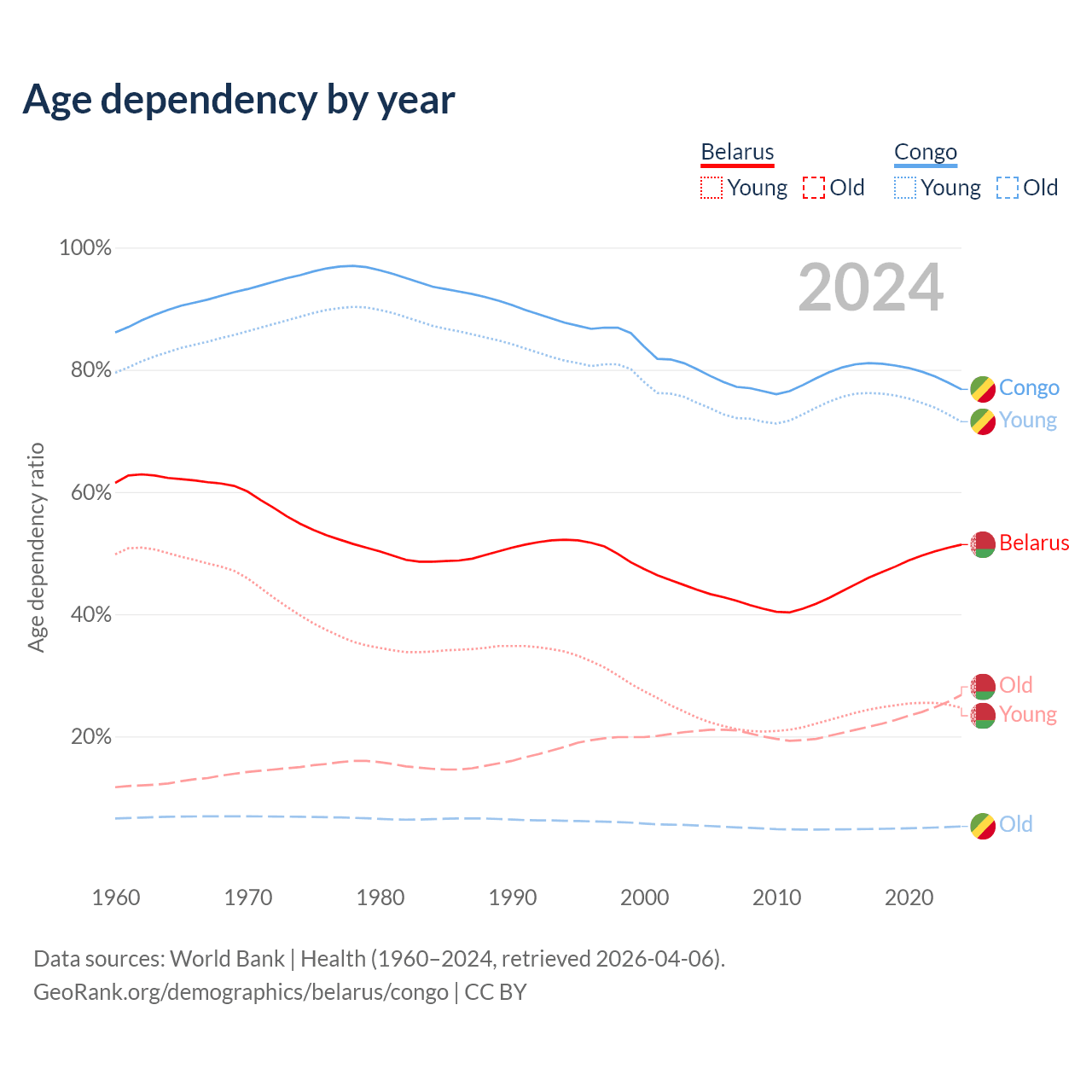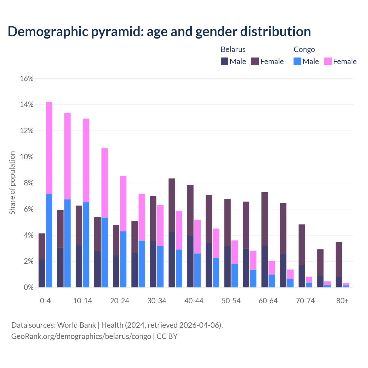- Belarus is ranked 35/196 by median age (oldest to youngest) vs 170/196 for the Congo.