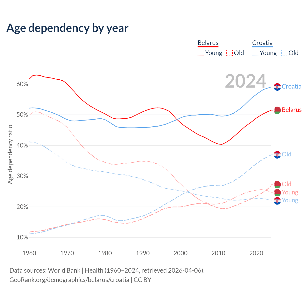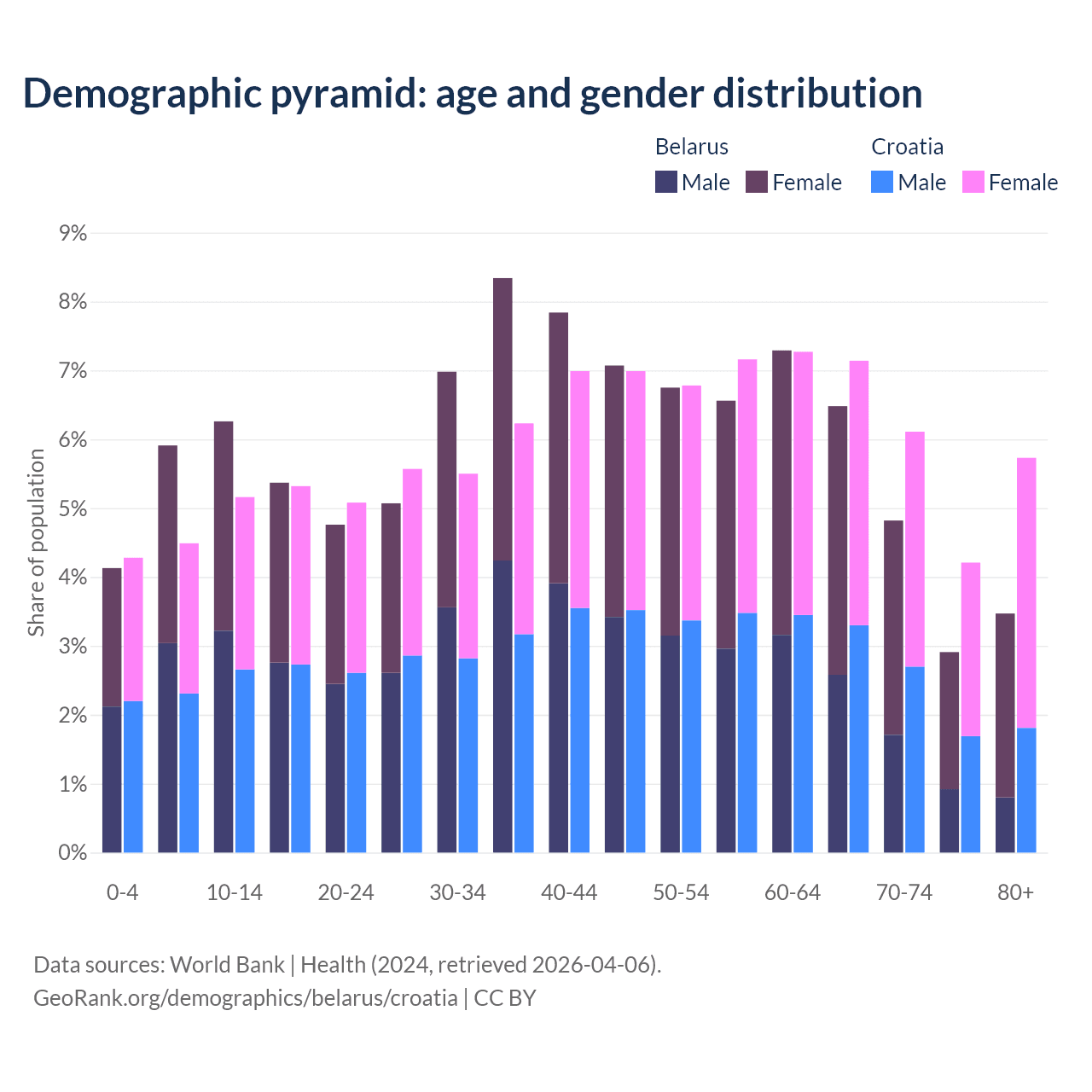 - Belarus is ranked 35/196 by median age (oldest to youngest) vs 11/196 for Croatia.