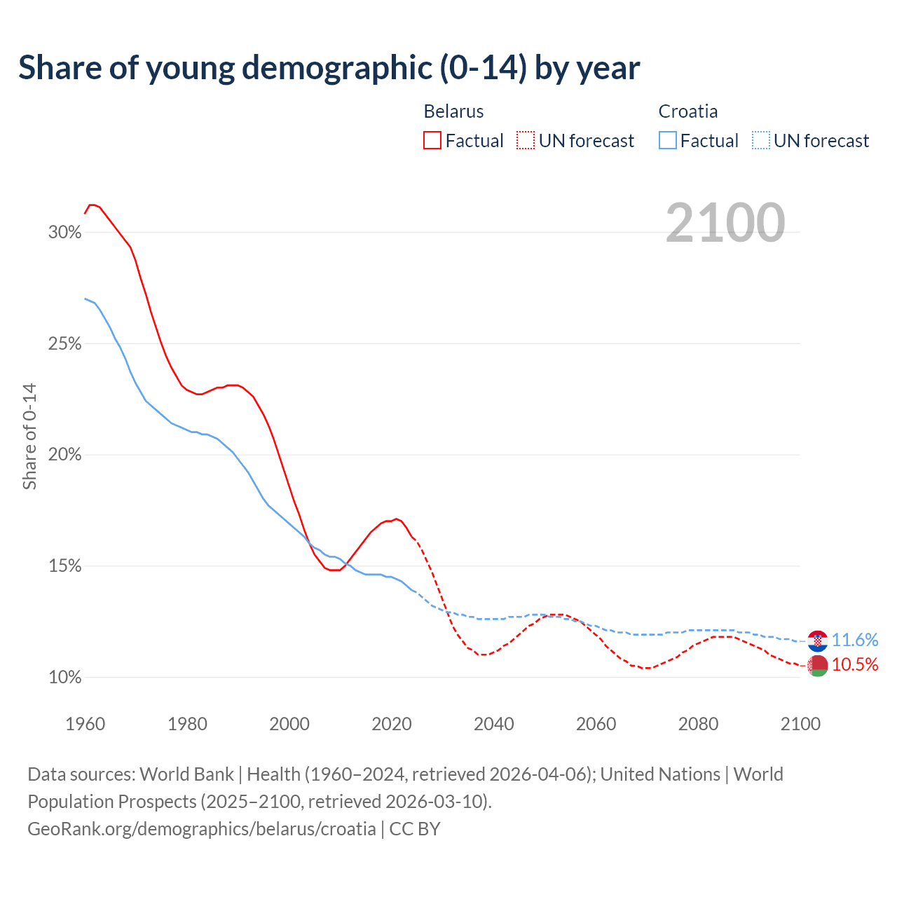 - The share of young demographic (0-15 years old) in Belarus is 16.3% vs 13.9% in Croatia.