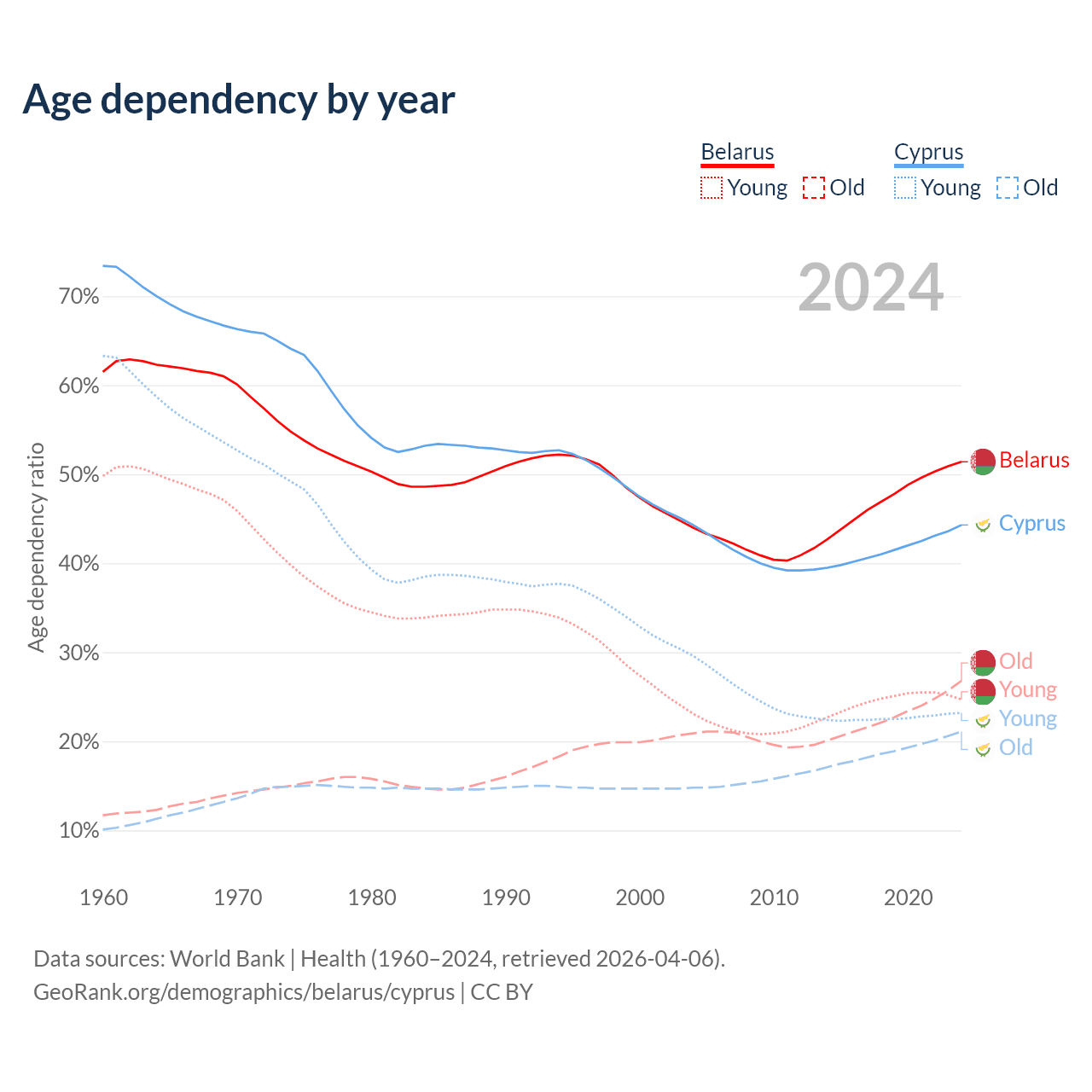 The share of older people aged 65 and over is 17.7% in Belarus and 14.6% in Cyprus. Life expectancy in Belarus compared to Cyprus .