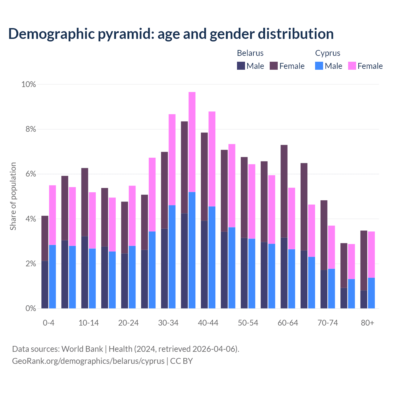 - Belarus is ranked 35/196 by median age (oldest to youngest) vs 52/196 for Cyprus.