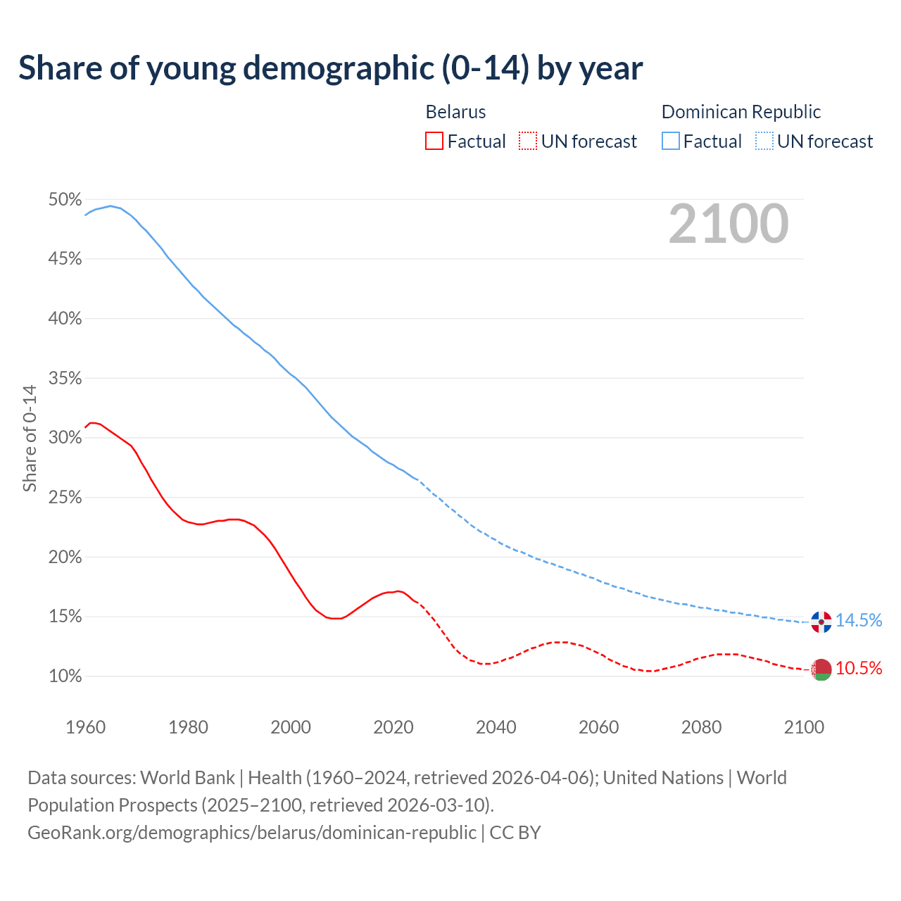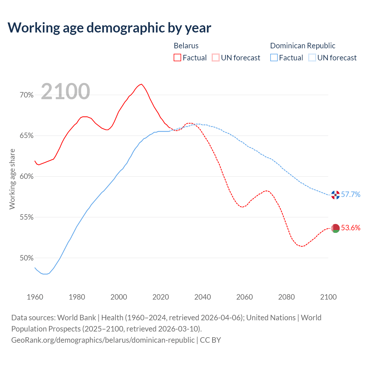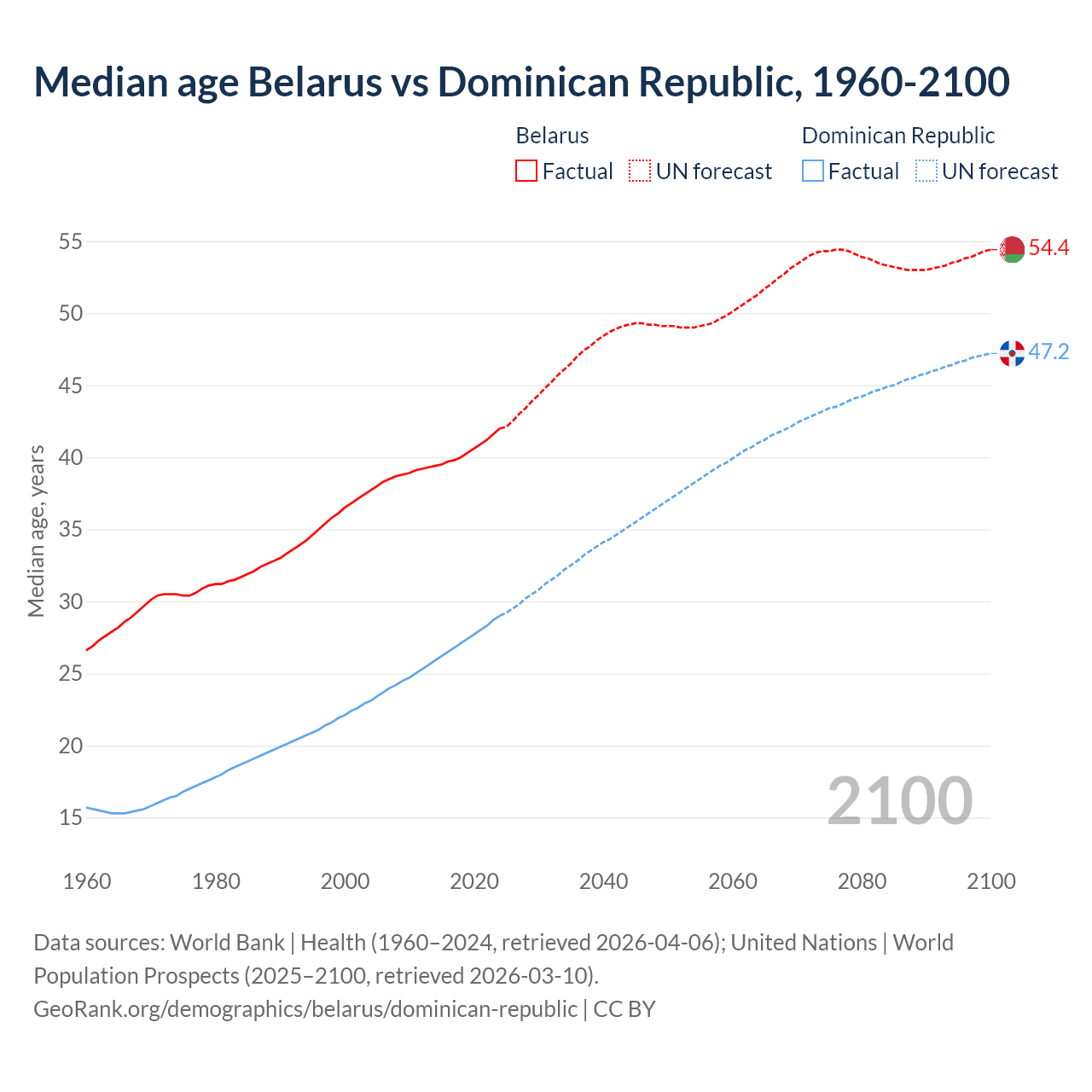 Median age Belarus vs Dominican Republic, 1960-2100