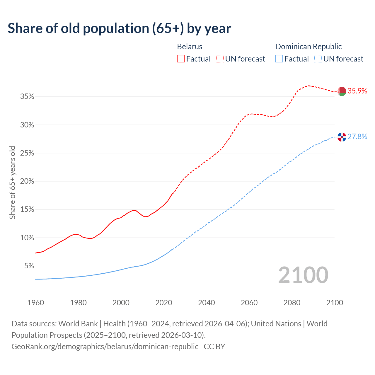 The share of older people aged 65 and over is 17.7% in Belarus and 7.88% in the Dominican Republic. Life expectancy in Belarus compared to the Dominican Republic .
