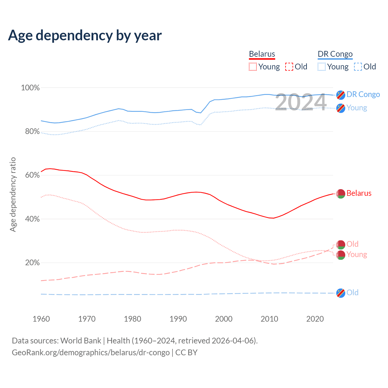 - Belarus is ranked 35/196 by median age (oldest to youngest) vs 191/196 for the DR Congo.
