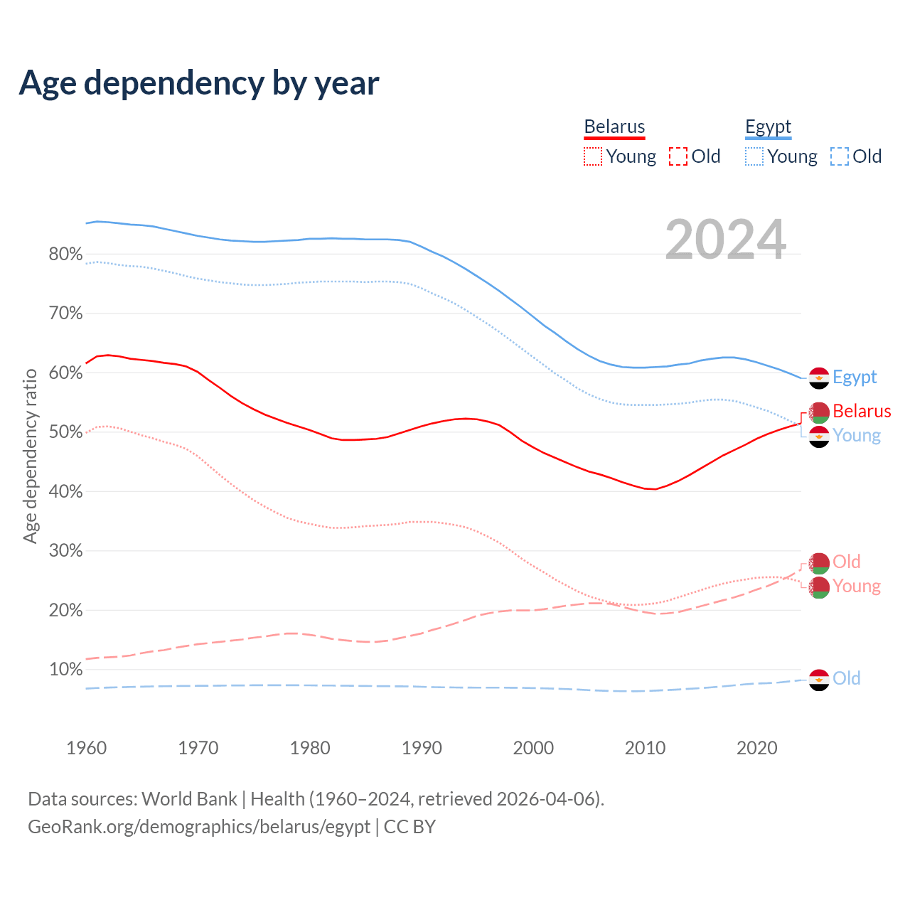 - The share of old-age demographic (65+) in Belarus is 17.7% vs 5.12% in Egypt.