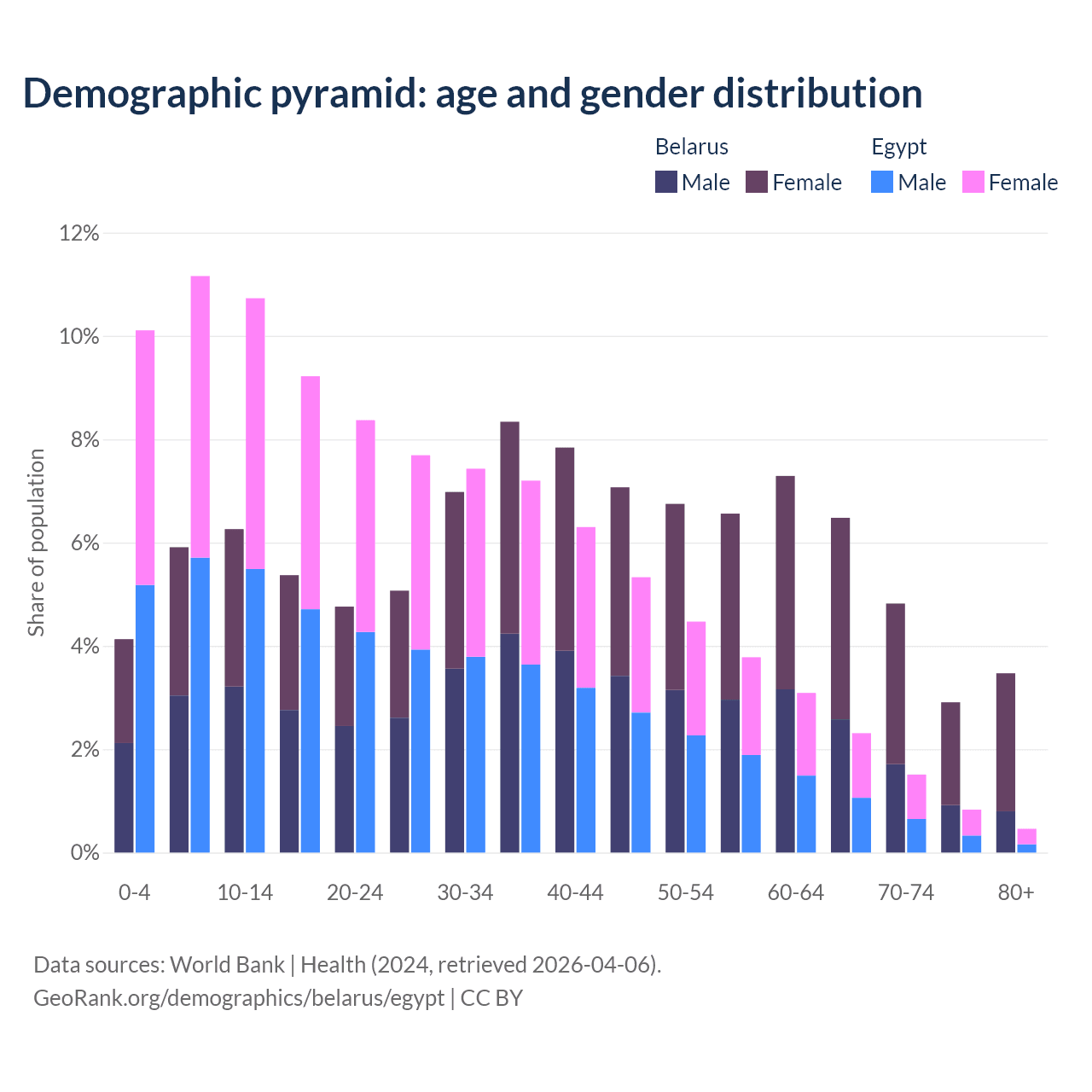 - Belarus is ranked 35/196 by median age (oldest to youngest) vs 133/196 for Egypt.