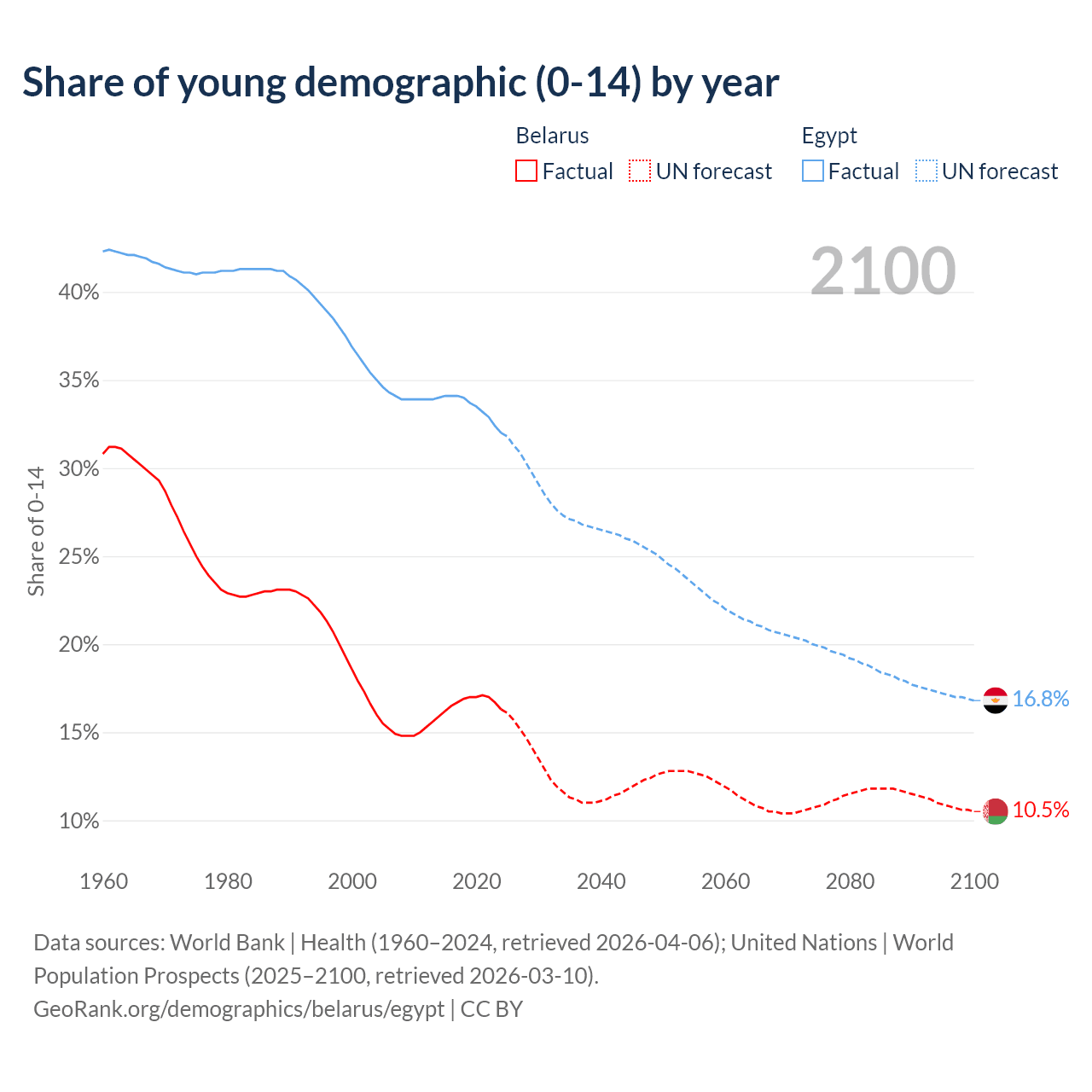 Median age Belarus vs Egypt, 1960-2100