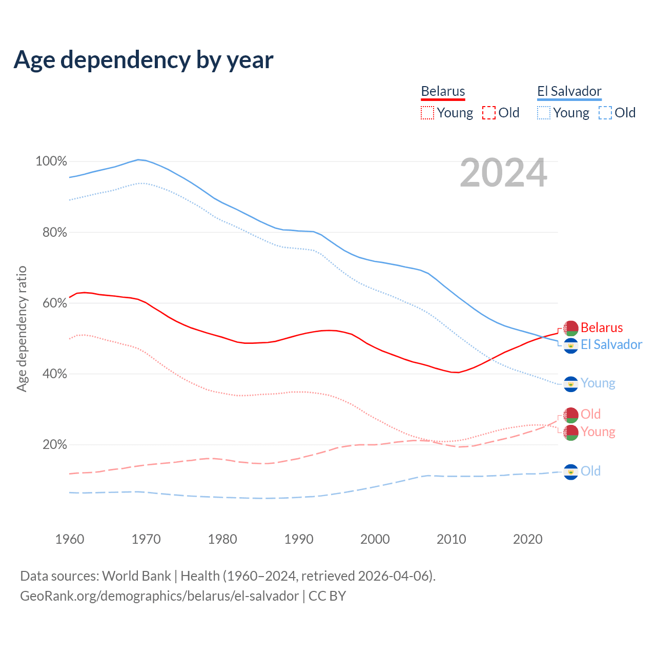 - Belarus is ranked 35/196 by median age (oldest to youngest) vs 115/196 for El Salvador.