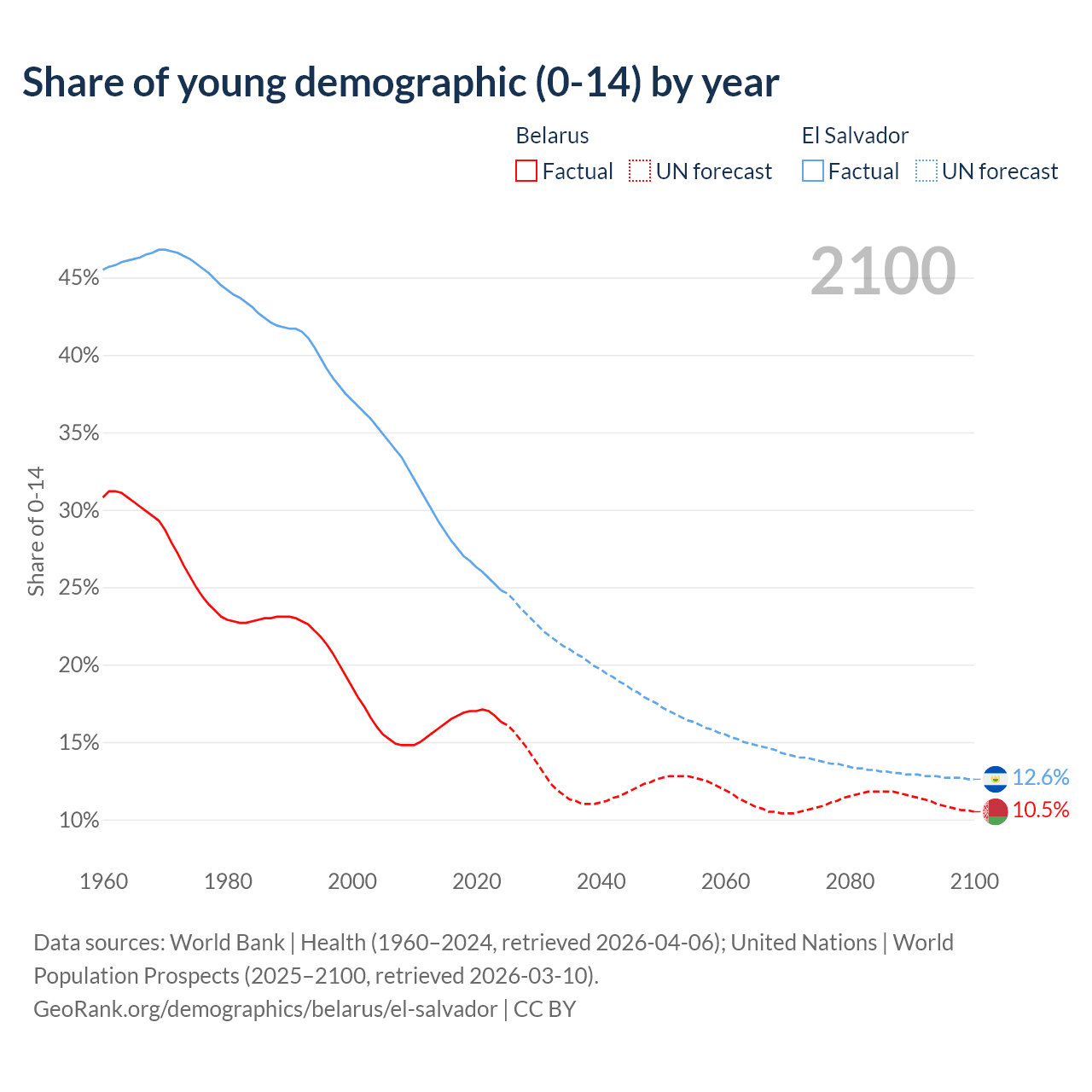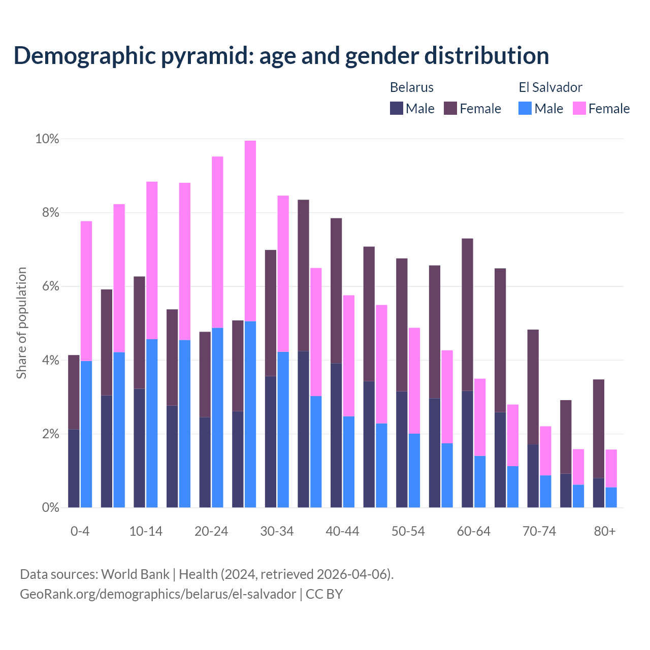 - The share of young demographic (0-15 years old) in Belarus is 16.3% vs 24.8% in El Salvador.