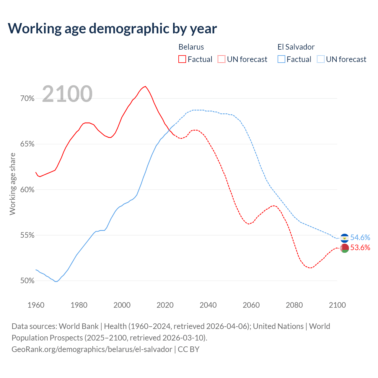 Median age Belarus vs El Salvador, 1960-2100