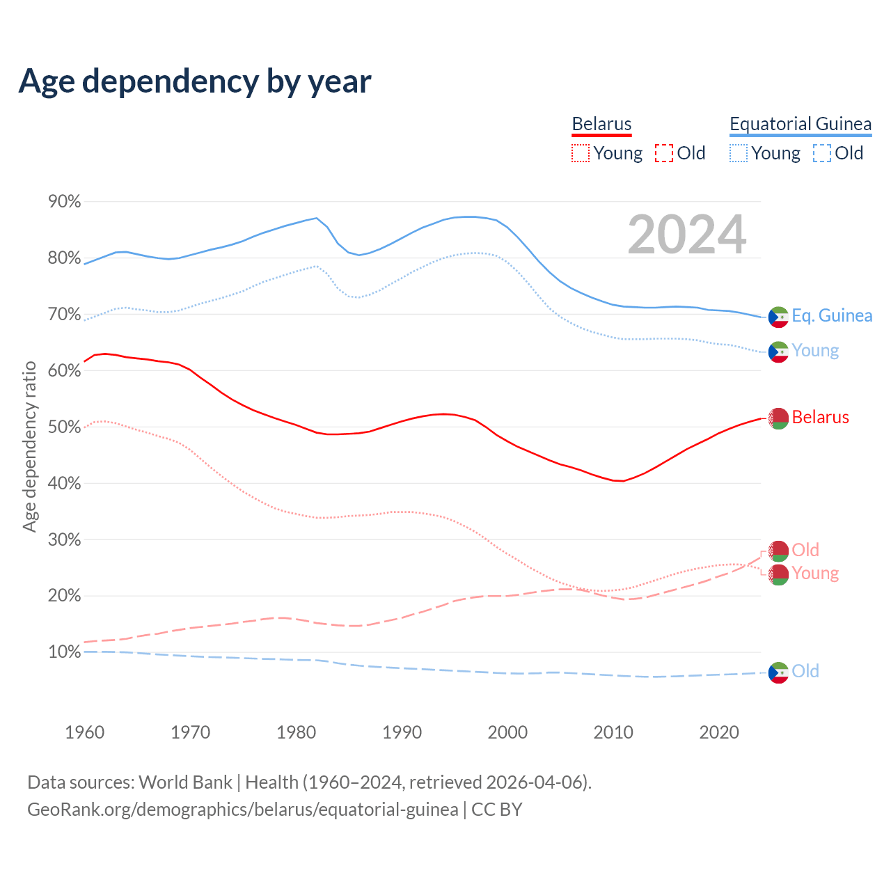 - The share of old-age demographic (65+) in Belarus is 17.7% vs 3.69% in Equatorial Guinea.