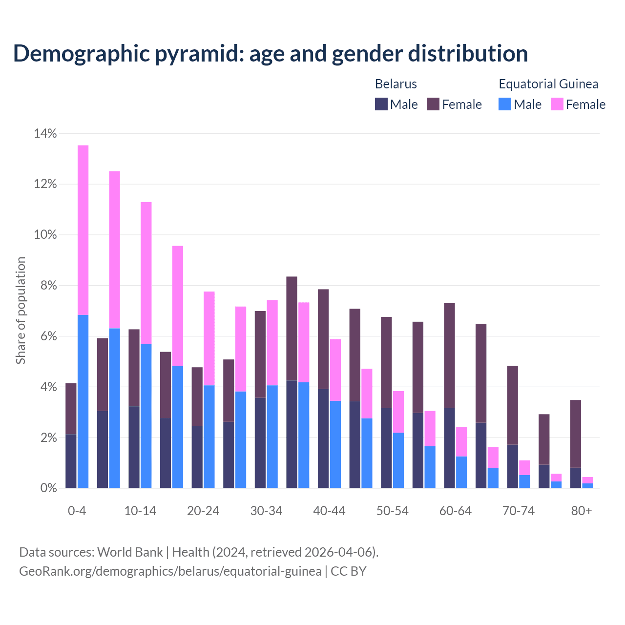 - Belarus is ranked 35/196 by median age (oldest to youngest) vs 148/196 for Equatorial Guinea.
