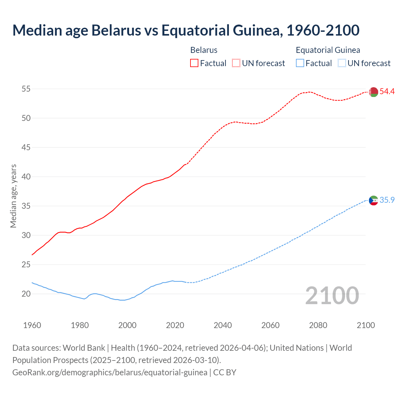 Median age Belarus vs Equatorial Guinea, 1960-2100