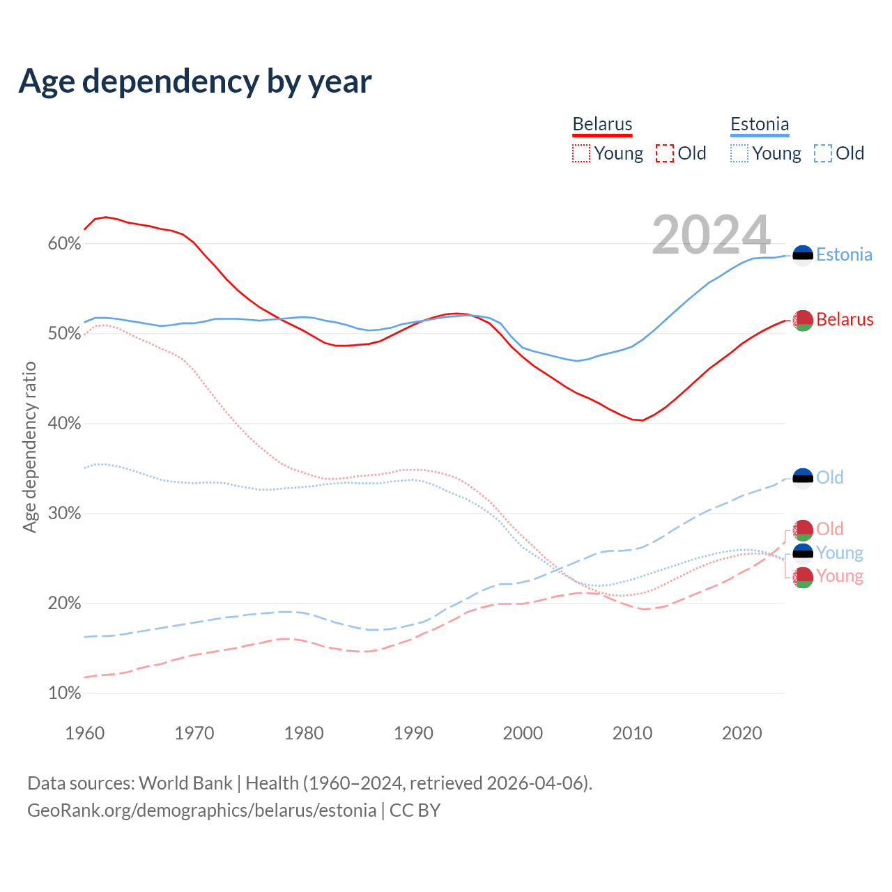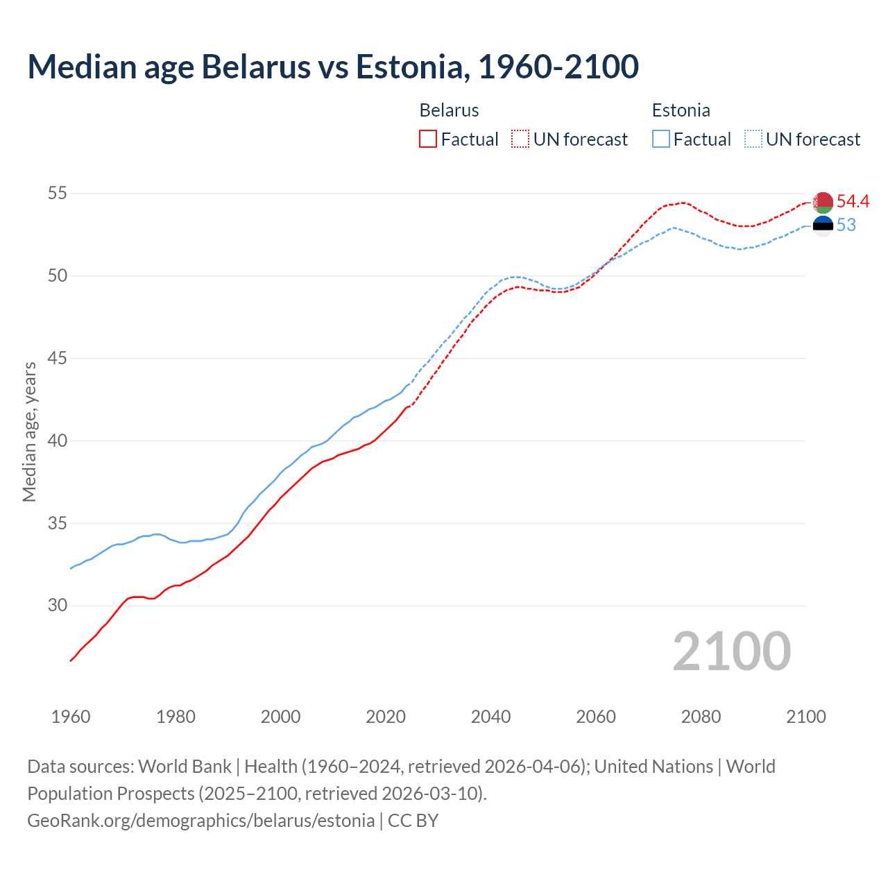 - Belarus is ranked 35/196 by median age (oldest to youngest) vs 25/196 for Estonia.
