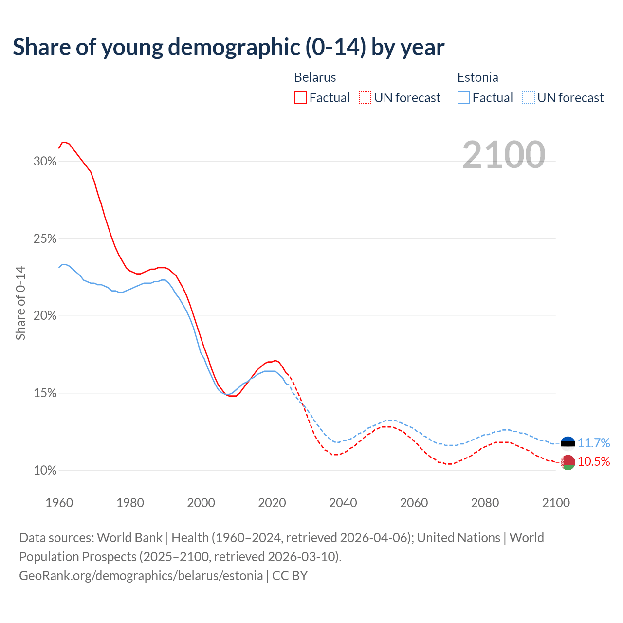 - The share of young demographic (0-15 years old) in Belarus is 16.3% vs 15.6% in Estonia.
