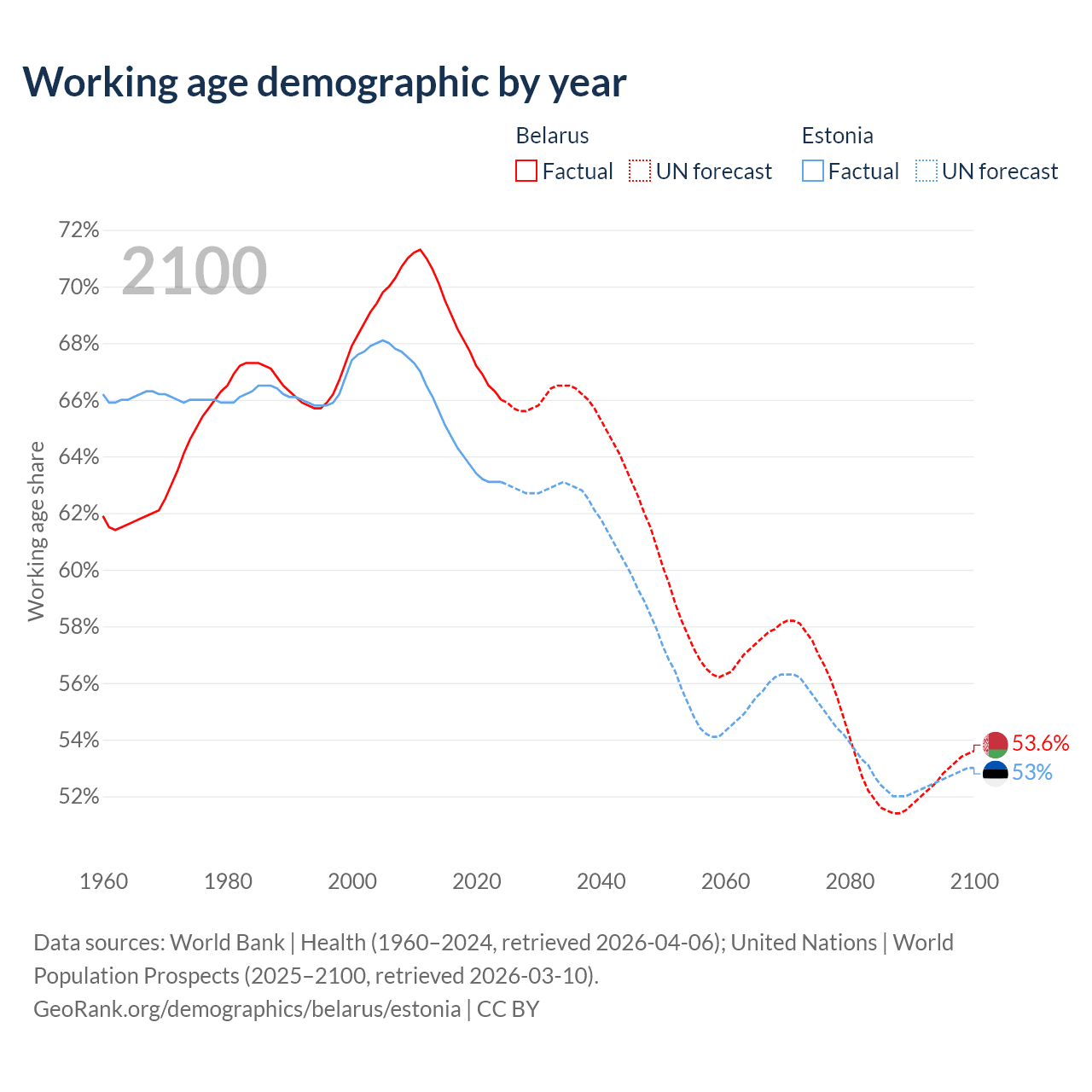 - Belarus has 5.95M working age adults (aged 15-64) vs 845K in Estonia.