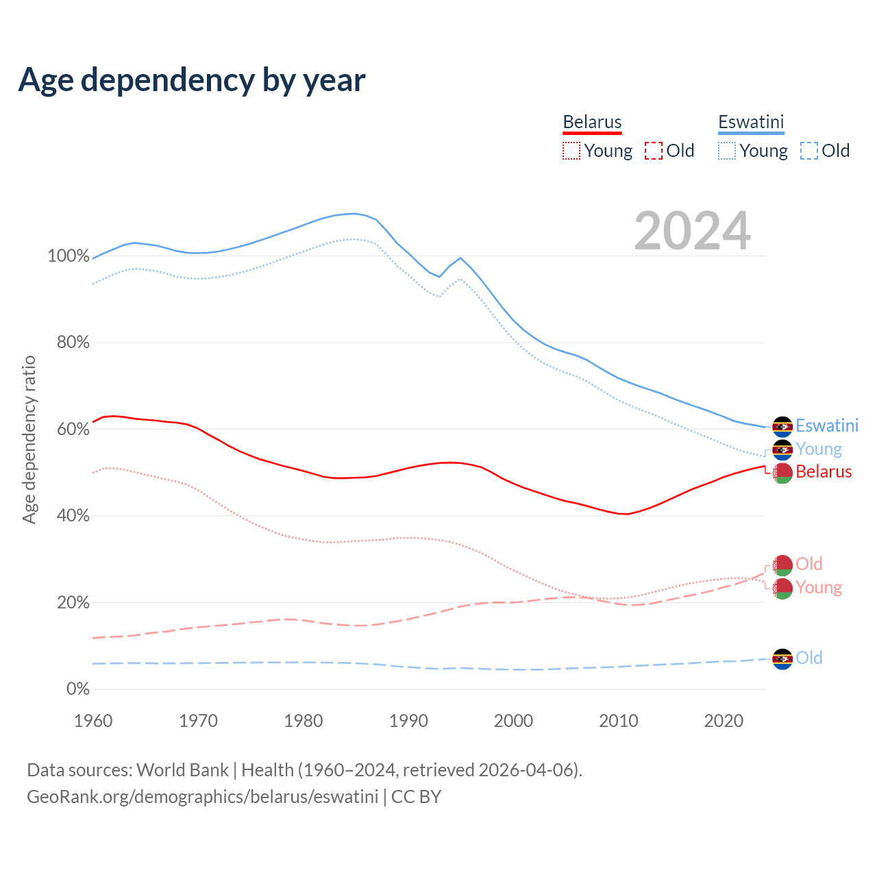 - Belarus is ranked 35/196 by median age (oldest to youngest) vs 141/196 for Eswatini.